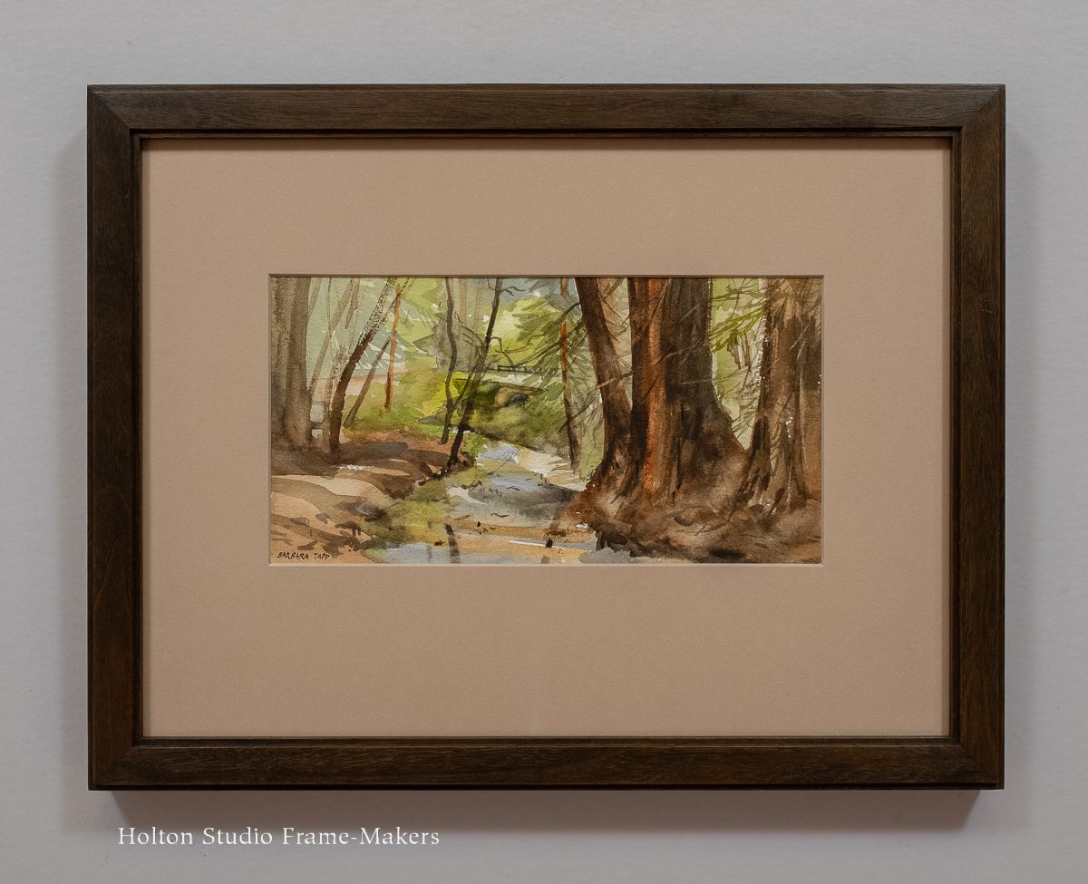2017. Watercolor on paper, 7 1/2″ x 15.” Framed in No. 2.1 CV Spcl—2”, Walnut (clear) with a 23kt slip. $1,100.