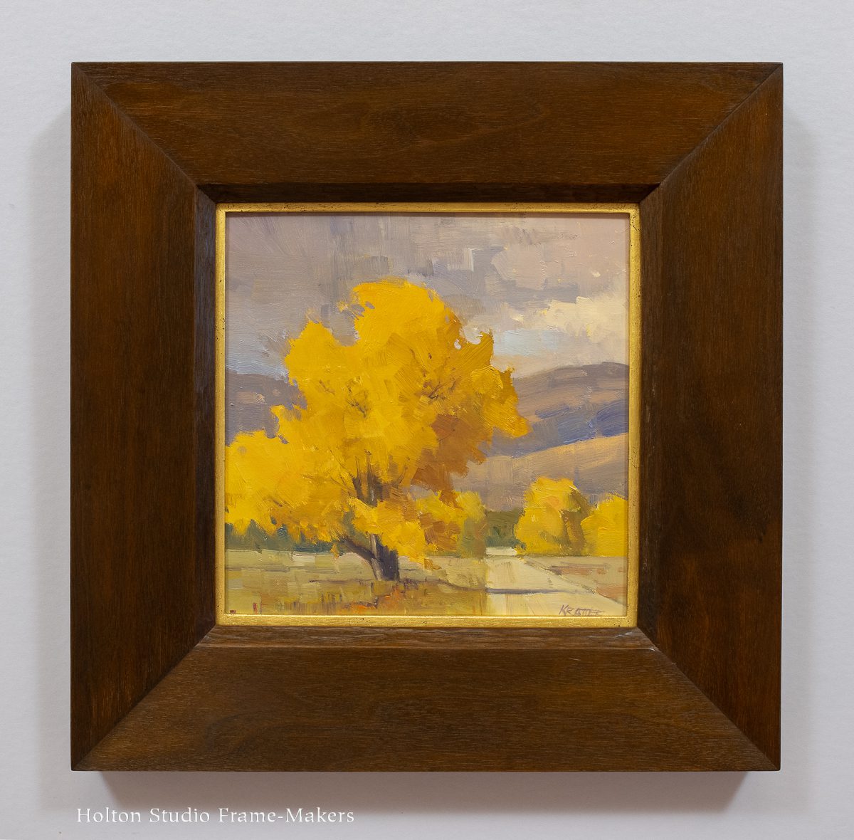2015, Oil on canvas board, 12″ x 12″. Framed in #17 cv with a Medieval Oak stain and a 23 kt gilt liner. This painting was created during Paul’s painting demonstration at the Holton Studio Gallery in June. Sold.