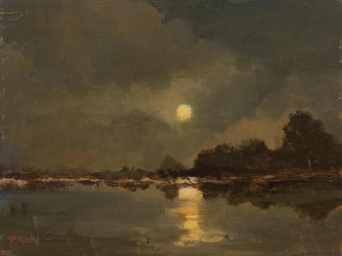 2015, Oil on board, 8″ x 10″. Framed in No. 238 in a low slope profile, 2-1/2″ wide in walnut with a 23 kt gilt slip that highlights the warm glow of the moon and its reflection on the water. SOLD