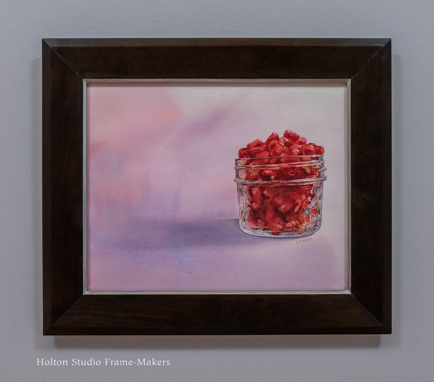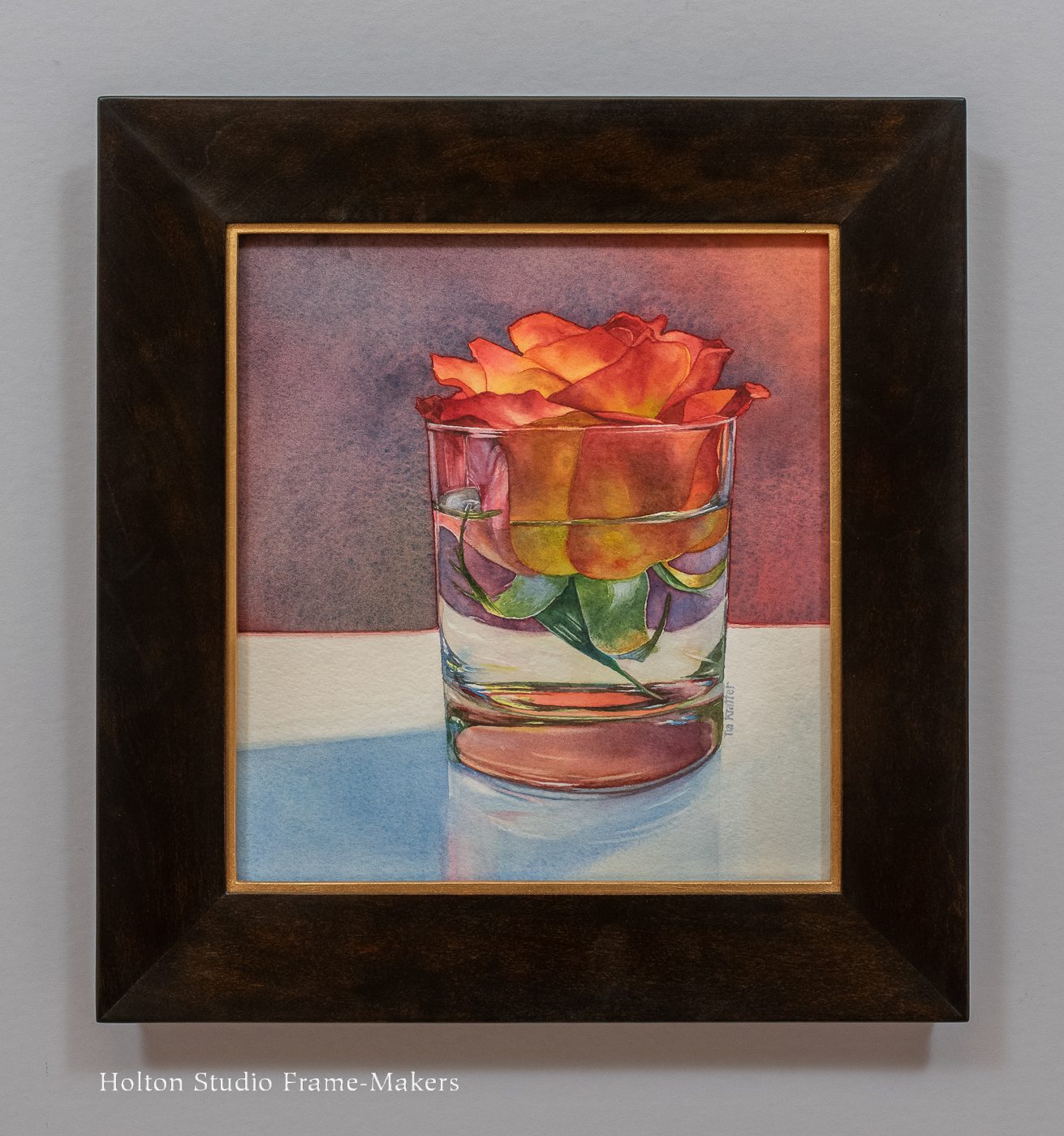 Framed in a No. 300 BC Low—2″ in cherry with Deep Red Brown stain. Rose gold slip. (Inquire for other frame options).