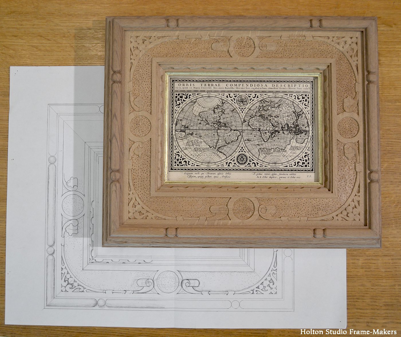 the illusion, rendered with light and shadow, of a three dimensional carved ovolo molding strives to join and shape the tangible reality of the surrounding architecture the viewer occupies, and (after a brief interruption by the pale gold coved slip) the frame recognizes and fulfills this with an actual carved ovolo at its sight edge—and proves the efficacy of a 400 year old print’s enduring presence and power to touch us.The pattern on the flat is strapwork inspired by the dense ornament surrounding the map proper. Strapwork is a style of ornament that imitates ironwork and is also characteristic in vernacular wooden cabinetry of the time, so seemed natural for the woodwork of the frame. (Worth noting that, on the theme of world exploration and expansion, as well as repeating and interconnecting patterns, strapwork originated with Islamic girih, coming to Europe from the middle east, and sailed on across the Atlantic to adorn New England cabinetry.)