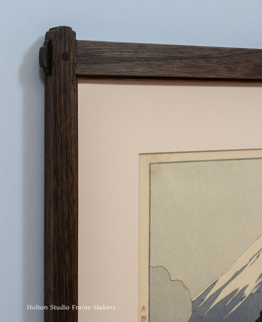 This first one is “Twilight Song in Amber,” 14 1/8″ x 19 1/2″. The frame is a No. 230—2 1/4″ in fumed quartersawn white oak with clear linseed oil finish, and an 18 kt gilt slip. One of the main ways a slope profile like this serves a picture is by enhancing perspective. With a view looking down a road or path or stream, a slope frame sustains the picture’s sense of depth and distance, helping it draw us in. And that’s precisely what Kim took advantage of here. She also enjoyed repeating and harmonizing the ochre-brown color—or dark amber referred to by her title?—of the fumed and oiled oak frame with the trees and shrubs in the shaded landscape. The muted, neutral tones of the frame enhance and intensify the rich colors in the picture. Also notice how she used the ray flake pattern in the wood of the frame to echo elements of the picture.