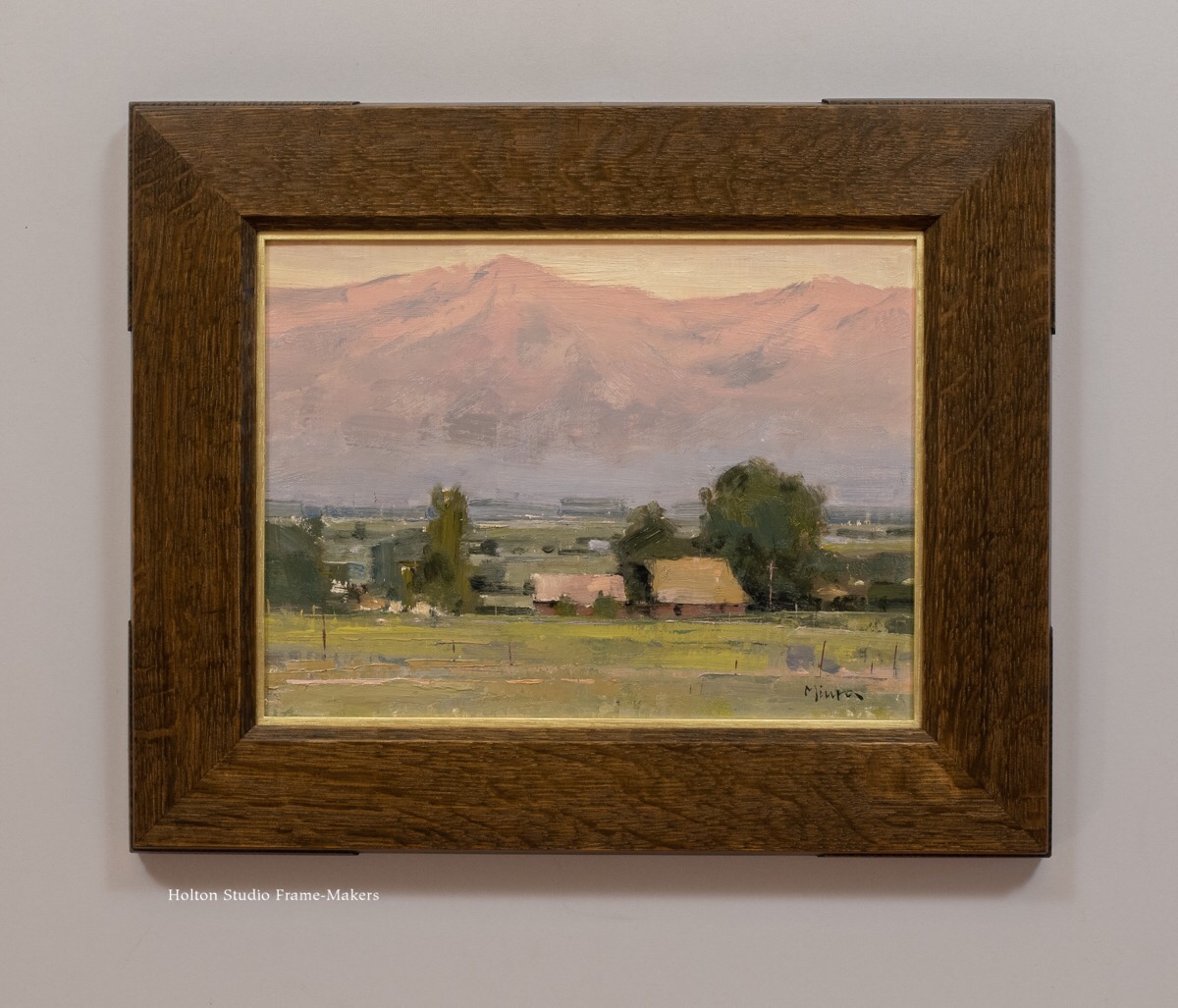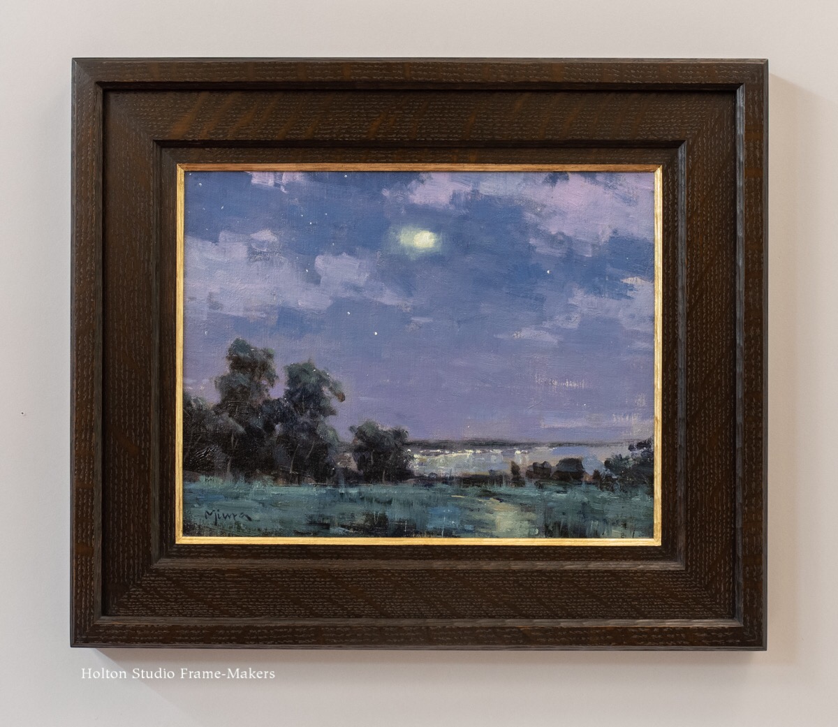 Shortly after, it came in handy for this 19th century oban size print, “Illusion”, at right, by Utagawa Kunisada (1786-1865). I liked the way it repeated the lines in the kimonos. It’s a plain 5/8″ wide square profile in walnut stained black, but with shaped corners. A red painted slip accented the shape, and further harmonized the print and frame.