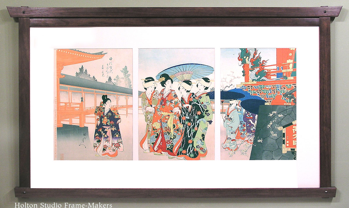 This is a lovely nineteenth century ukiyo-e triptych by Hiroshige which we framed in a modified version of our Yoshida frame. We’re calling it the Flaired Yoshida, but it’s just one example of what can be done with flairs on mortise-and-tenon frames. It’s in walnut with a black wash. The top and bottom members are 3/4″ wide, the sides 1″. The overall size is about 21″ x 38″. Trevor Davis made it. While he was at it, he also made a batch of four ready-made frames with these flaired corners, along with a batch of four Yoshidas, all in oban size (15″ x 21″) and in four different woods—all for sale at our new online store, shop.holtonframes.com.