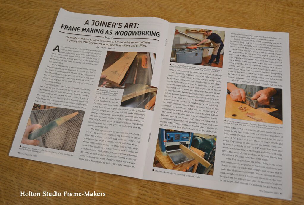Picture Framing Magazine has just published Part III of what will be a six-part series I’m writing for them called “A Joiner’s Art: Frame Making as Woodworking.” The first installment, which came out in May, introduced the topic with some history and an overview (read Part I here), while Part II (here) delved into the craft beginning with a discussion of wood and the workshop. Part III, in the December 2025 issue, explores selecting and milling wood, and cutting moulding profiles. You can read it here.