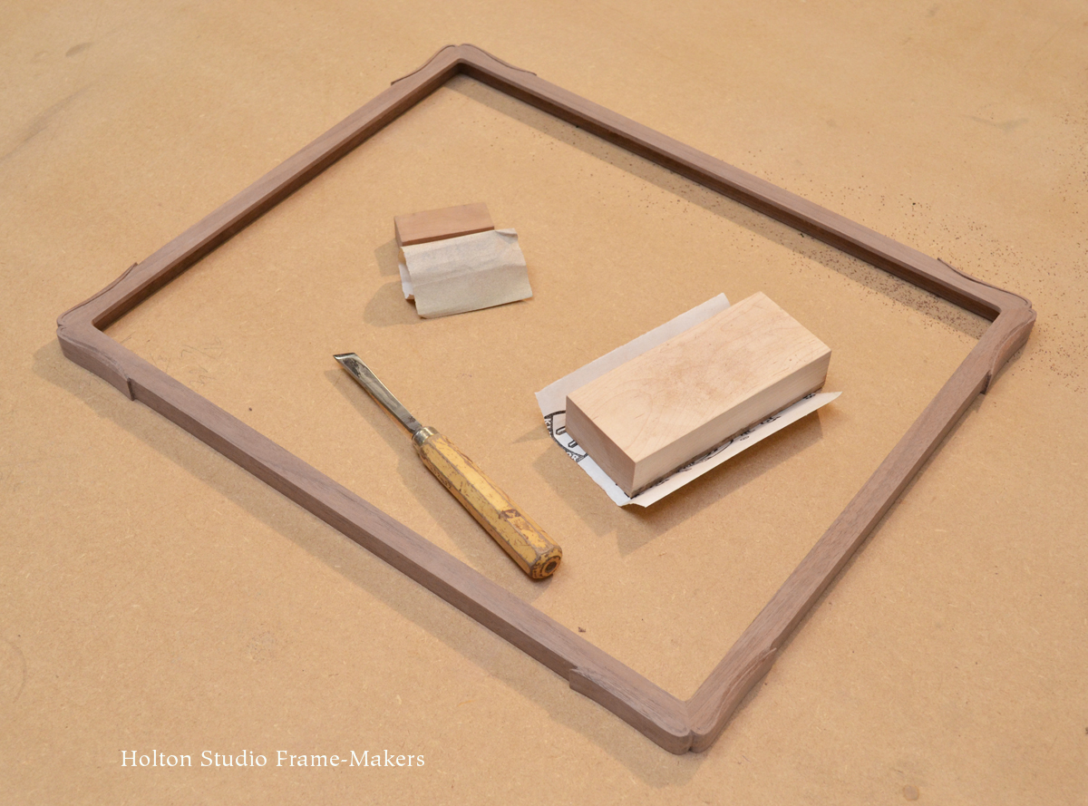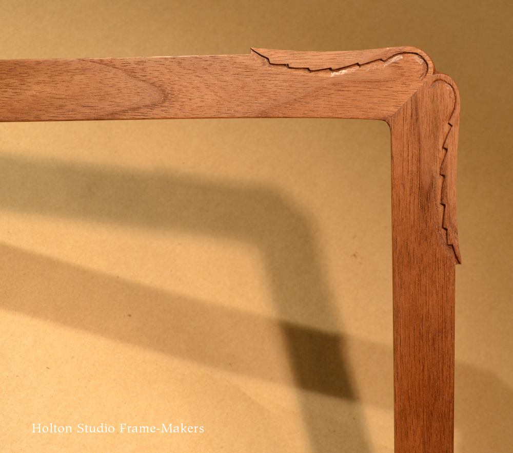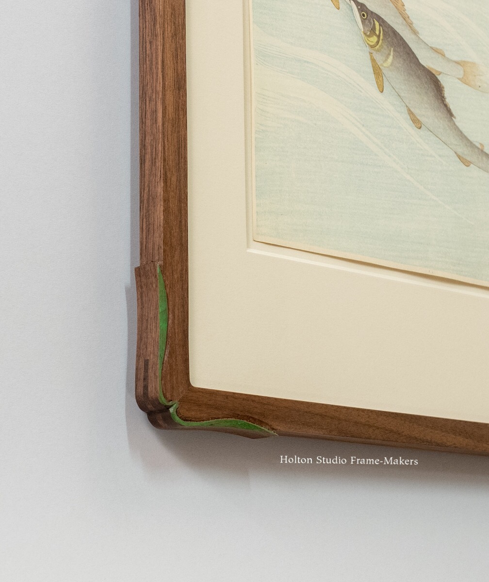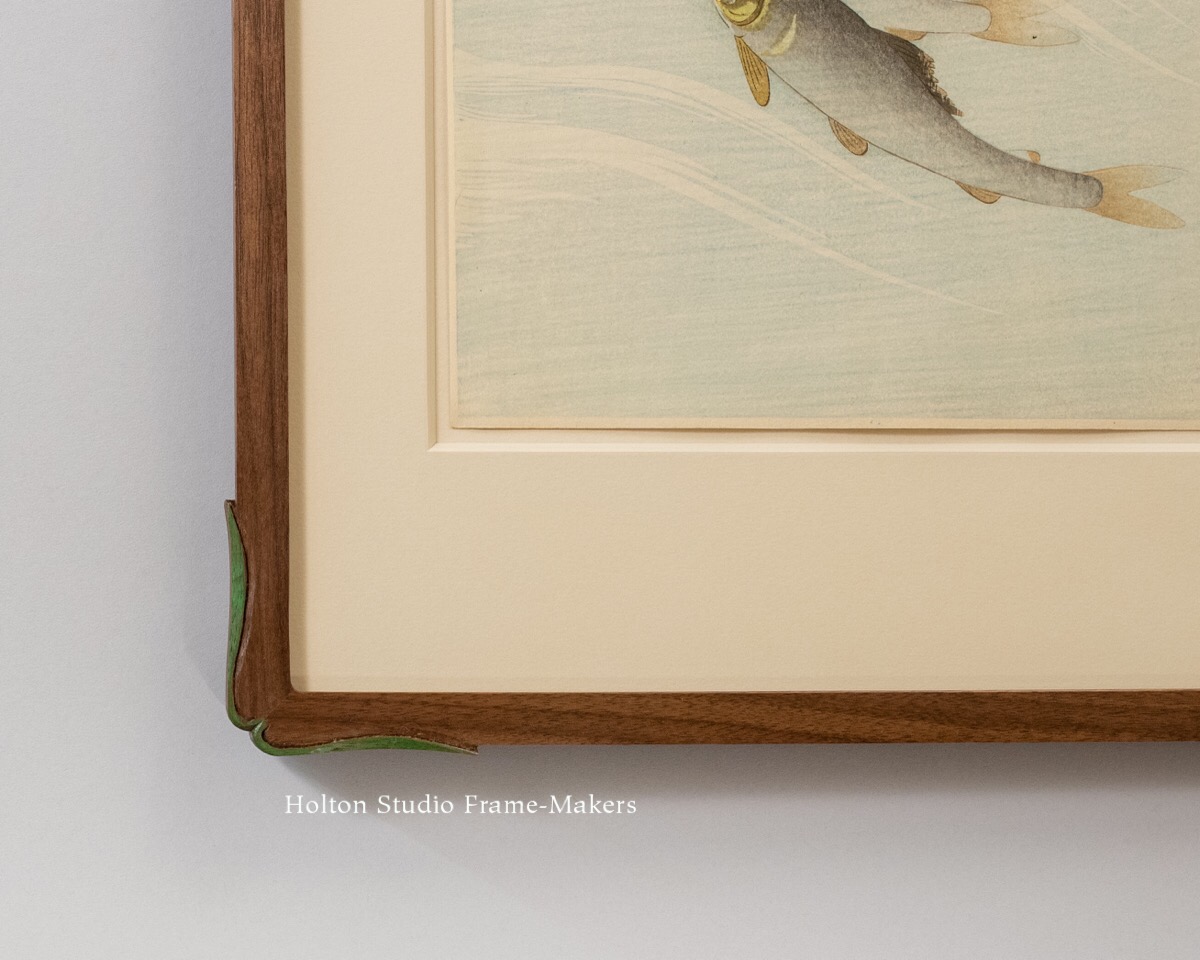 The woodblock print is about 13″ x 11″. Because there is almost no margin, we floated the sheet in the opening of an 8-ply mat, which is a very pale green. The 5/8″-wide walnut frame is like our Kobe corner frame (see the example at the bottom of the post), but I modified the corner shape by carving a leaf pattern taken from the print and painted the leaves green to match as well. I’m calling this style frame the Kobe Leaf. Scroll down to see a few process photos as well as corner samples of two other Kobe Leaf designs.
