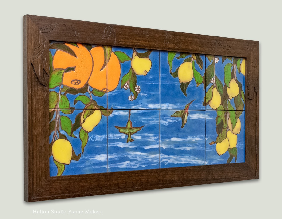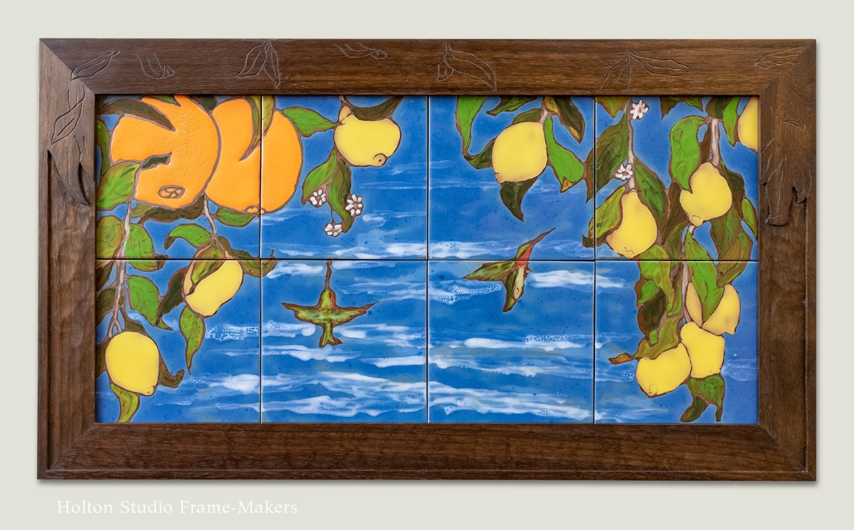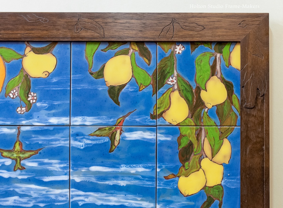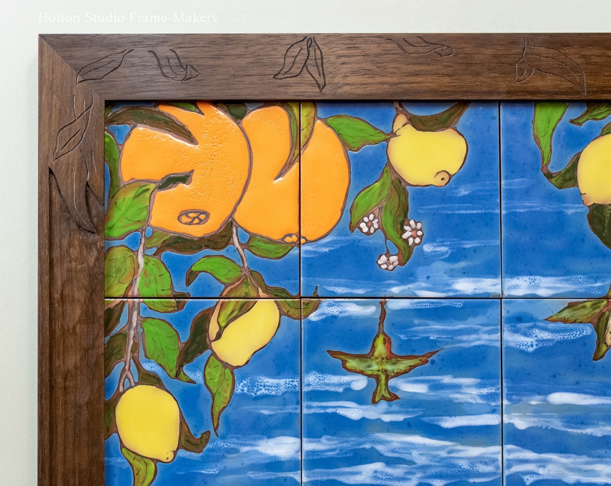 This is a set of contemporary Italian tiles in another example of what I’m calling, for lack of a better term, a sheltering frame, a bit like the one discussed in my last post on framing a William Rice print. Each tile is 6″ x 6″, so the whole set of eight is about 12″ x 24″. The 2″ wide carved frame is walnut, lightly stained. I designed the frame to expand on the sense of sitting under, and being sheltered by, a pair of citrus trees. To do that, I channeled the tilemaker’s rendering of the leaves, simply carving them in outline, and using the sheltering approach—making the top part of the frame heavier.