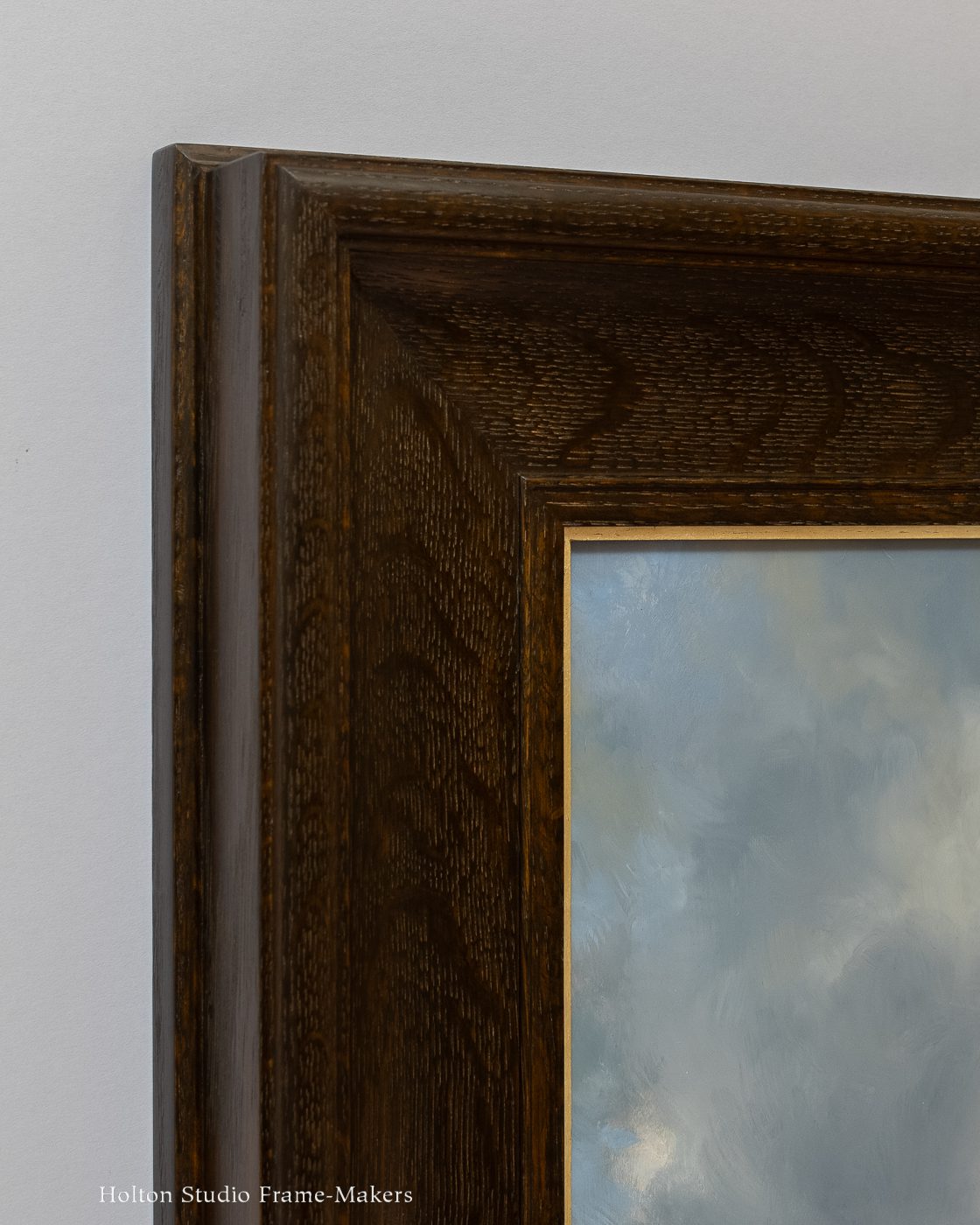 We made it a 3-1/2″ wide Compound Mitered frame, No. 318 + Cap 811 in quartersawn white oak (Saturated Medieval Oak stain), with a gilt slip. I chose a cove profile for its effect in enhancing the forms depicted (the rocks and cliff, the breaking waves, and the swirling clouds) as well as the dramatic perspective, which plants us firmly on the rocky beach but also carries our eye to the precarious fate of the ship anchored in the distance. The fine bead near the sight edge acknowledges and underscores the artist’s fine brushwork and rendering. The dark stain is the perfect shadowy foil to surround Erik’s masterful handling of light, while the gilt slip seems to reflect the bright sunlight and provide emphasis on this remarkably powerful scene.