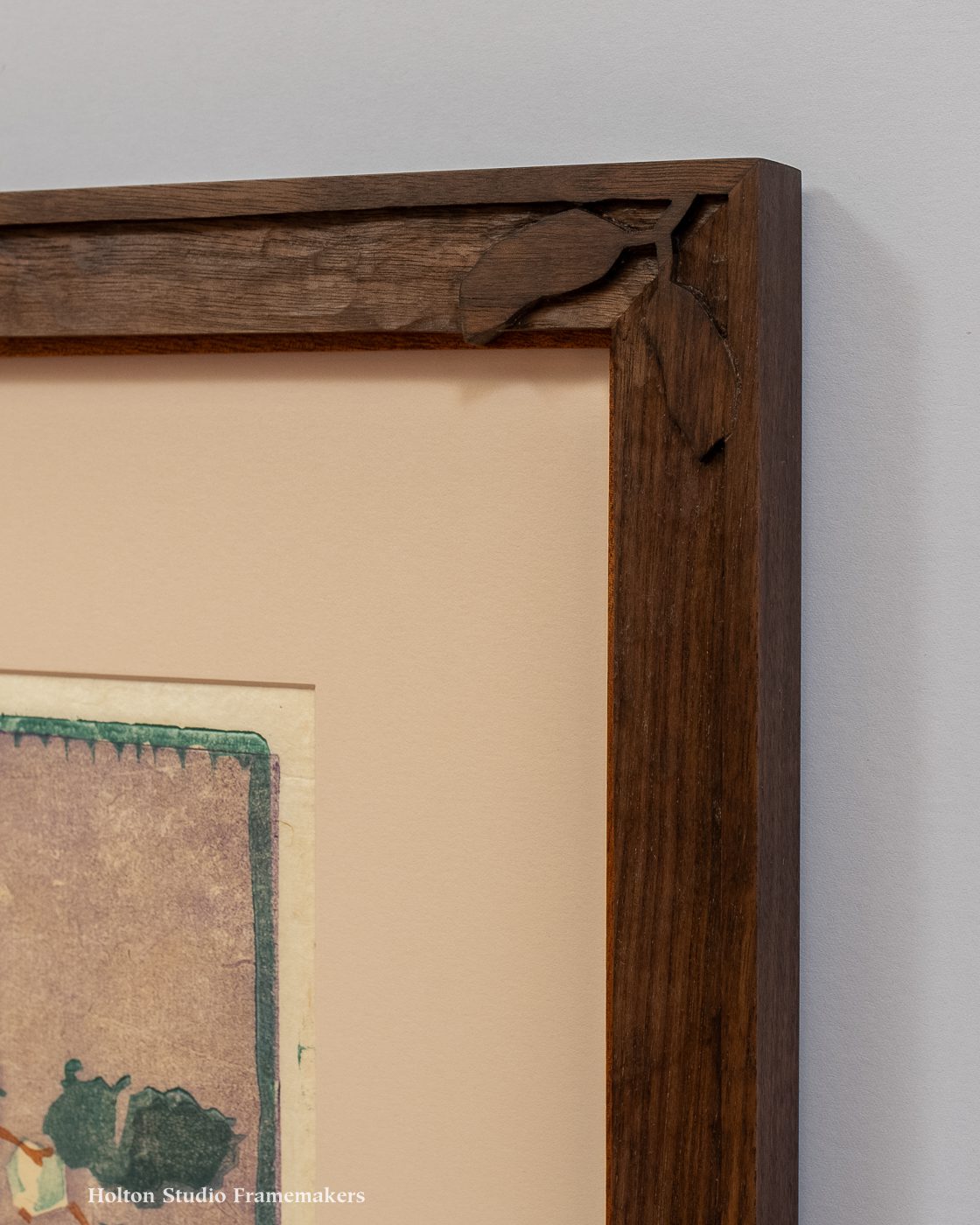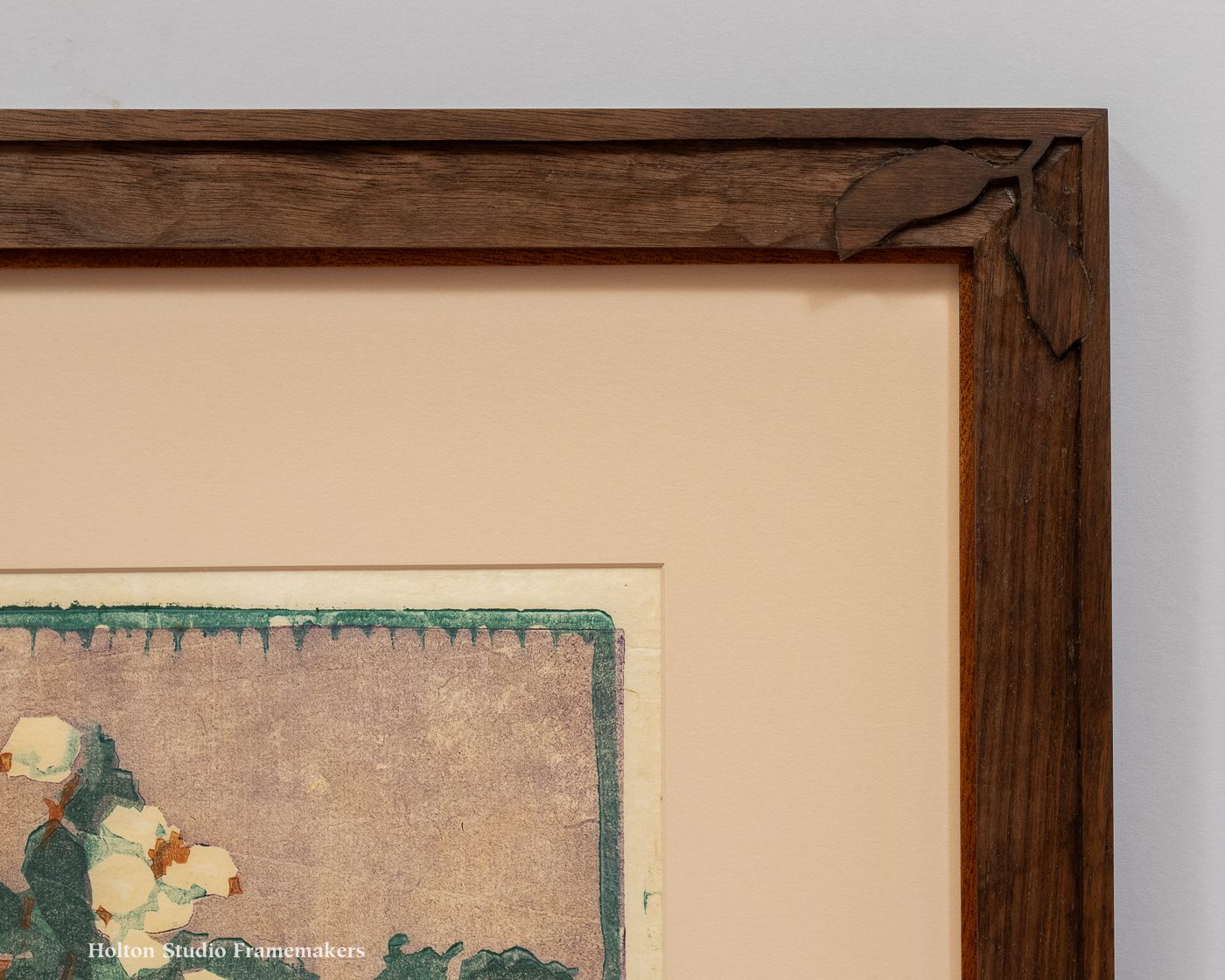 My last post was on the possibilities for especially sympathetic framing for block prints. Here’s another example of how a frame carved in the same manner that the block for the print was carved naturally harmonizes with the print. The early twentieth century picture of a glass of flowers is by Elisabeth Consentius (German, 1878-1936). The image is about 11″ x 11″. We set it in a 3″ wide solid core rag mat and a 1-1/4″ wide walnut frame finished with linseed oil and wax. The frame’s corners are carved with loosely rendered leaves inspired by those in the print. They’re simply raised, flat leaf shapes; no modeling. So again, should you ever, for some strange reason, want to make a print from the frame, you could. The important thing, though, is the way the frame echoes and honors the printmaker’s art.