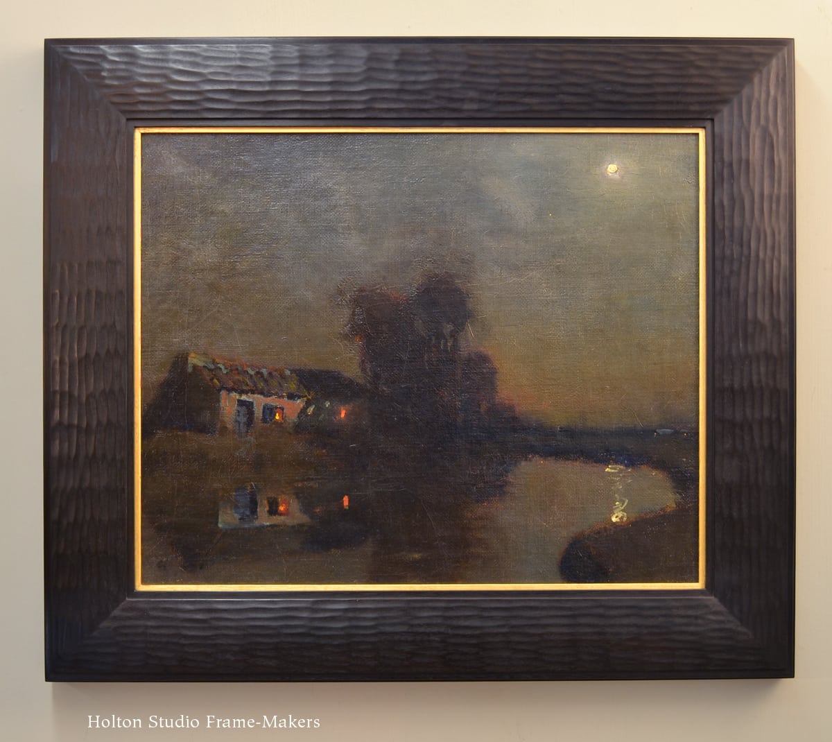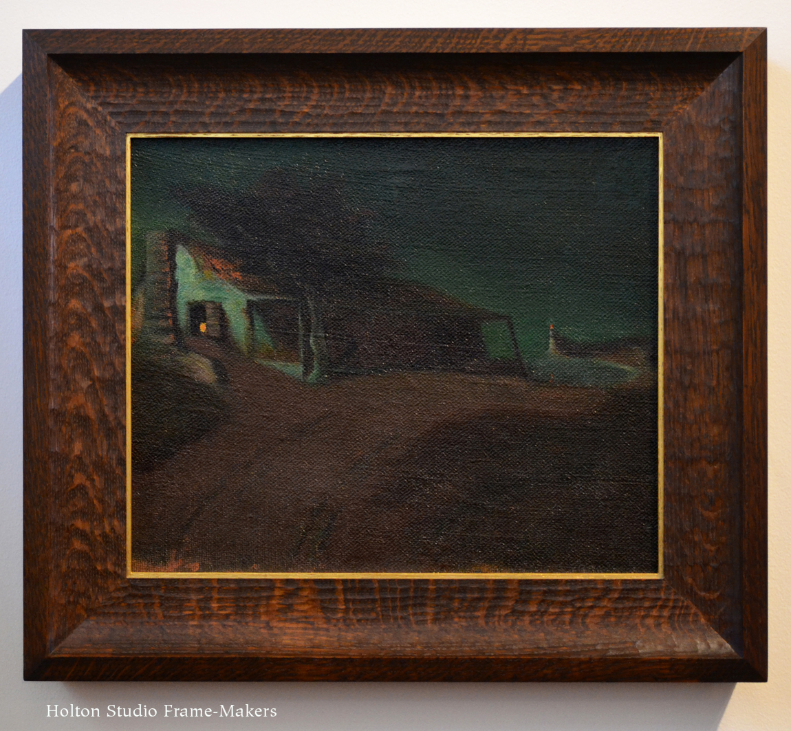 We framed “Moonlight Adobe” in a stained quartersawn white oak frame, No. 22.6 CV at 3″ wide (at right). To suit the simple architectural subject of the painting, the architecture of the frame had to be simple and reflect what’s so appealing about the adobe home: that our part in its making is subordinate to nature’s part—the beauty of the wood it’s made from. The overall form is a slope that repeats the angle of the hillside as well as the home’s tile roof. A sight edge chamfer and reverse bevel at the back edge add to the theme of angularity. Those two elements are carved, which picks up the textures of the surfaces depicted as well as that of the painted canvas. The hand carving is also a nod to a key virtue of these old structures that artists like Peters deeply admired: that they were, as Charles Keeler put it, “the work of hands instead of machines.” The slender sight edge slip is finished in bronze wax to echo the inviting lights inside the house and to give the dark painting emphasis on the wall.