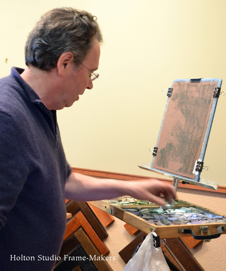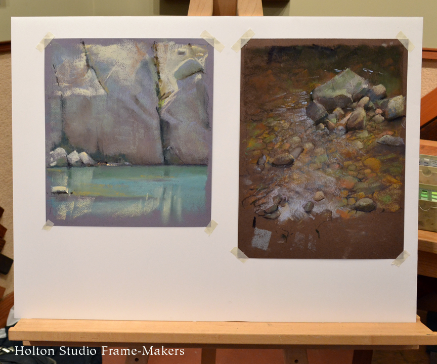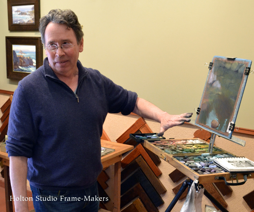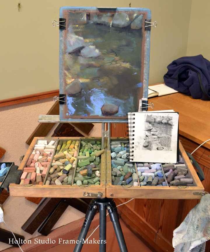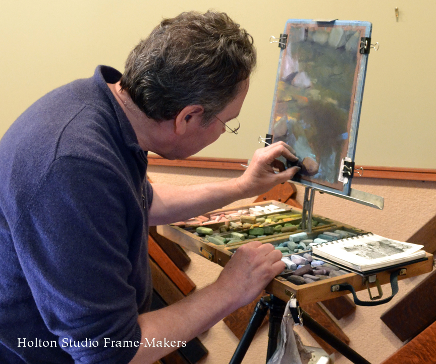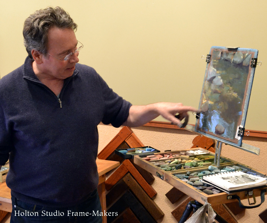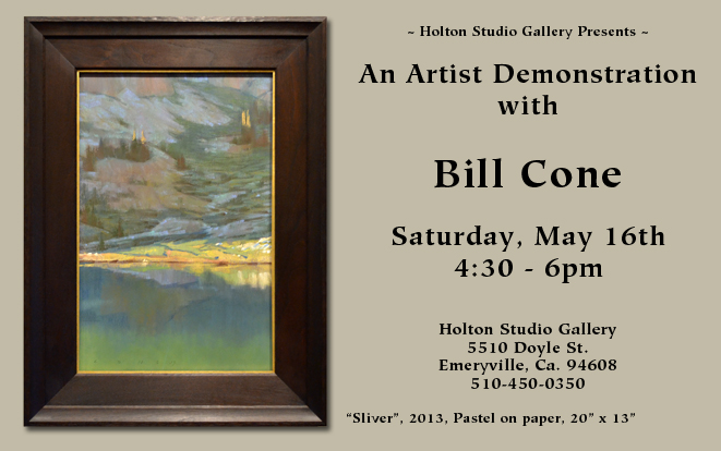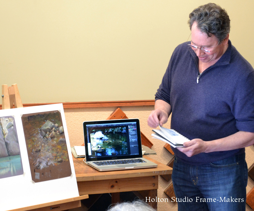 An accomplished landscape painter and Production Designer for Pixar Animation Studios, Bill Cone has made hundreds of pastel painting studies for films and taught classes on lighting and color at Pixar for the last 10+ years and lectured at numerous plein air conventions and art events. On May 16th, 2015 in the Holton Studio Gallery, we had the pleasure of watching Bill develop a pastel painting for a small audience. He presented a slideshow of images from the yearly backpacking trips in the Sierras, which he’s been organizing for the last 10 years with Paul Kratter and a group of local artists. He also brought in his latest work to share with the audience. Bill then shared his sketchbook and answered questions about his materials and techniques before starting his demonstration, in which he created a pastel painting of a riverbed scene. Below is a series of photographs from the event, showing the progression of his painting. Thank you, Bill for the great artist demonstration!