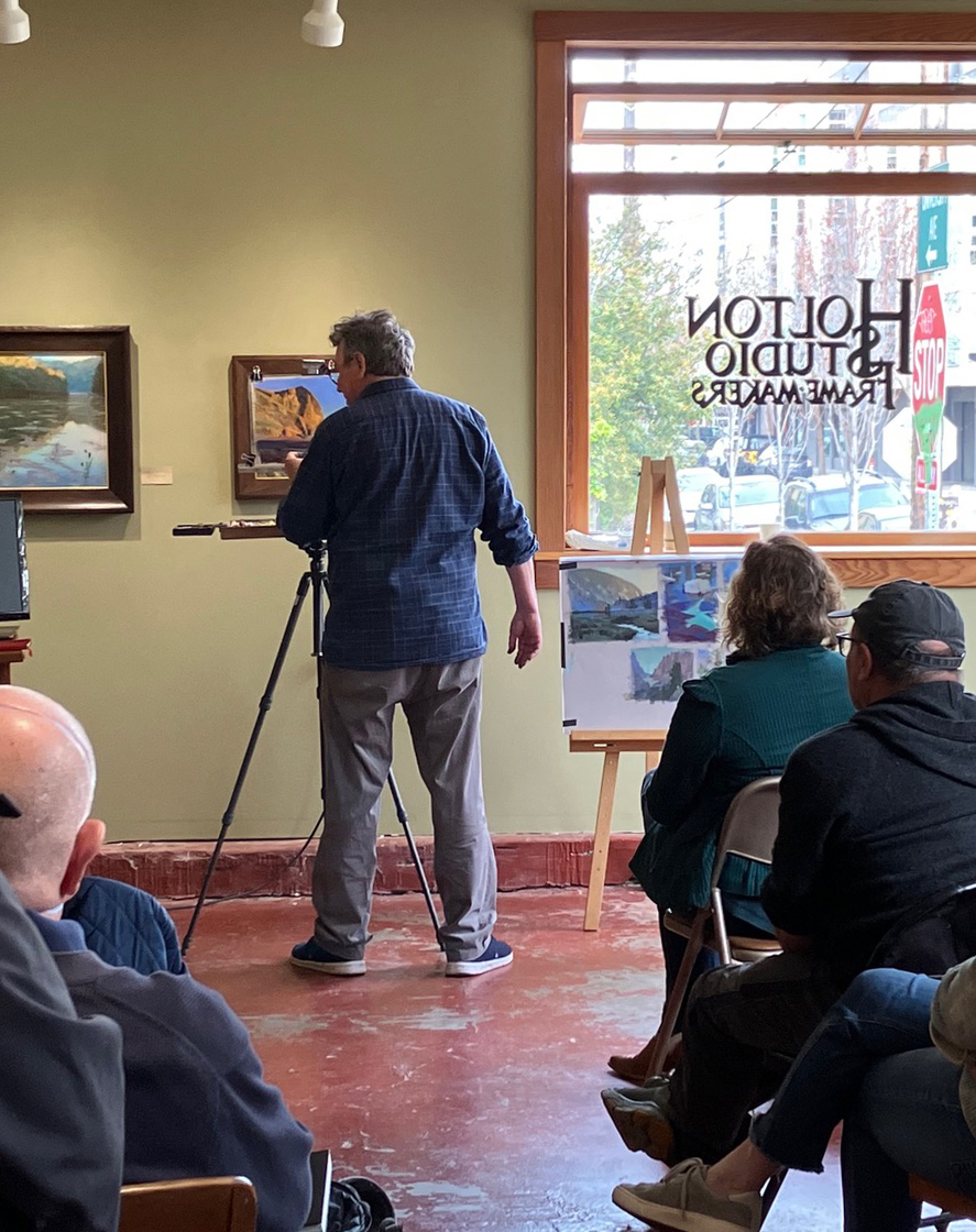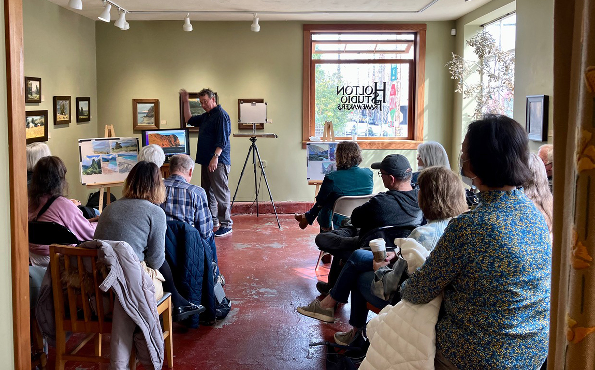 This morning, we were pleased to host a pastel demo by the incomparable Bill Cone for California Art Club members. With several attendees having little or no experience with pastels, Bill covered the basics before executing a seascape based on a photo he took on a recent visit to Maui. Bill’s dazzling expertise always comes with plenty of laughs, keeping the crowd rapt for two hours. Information about his lectures and workshops can be found on his Instagram account: