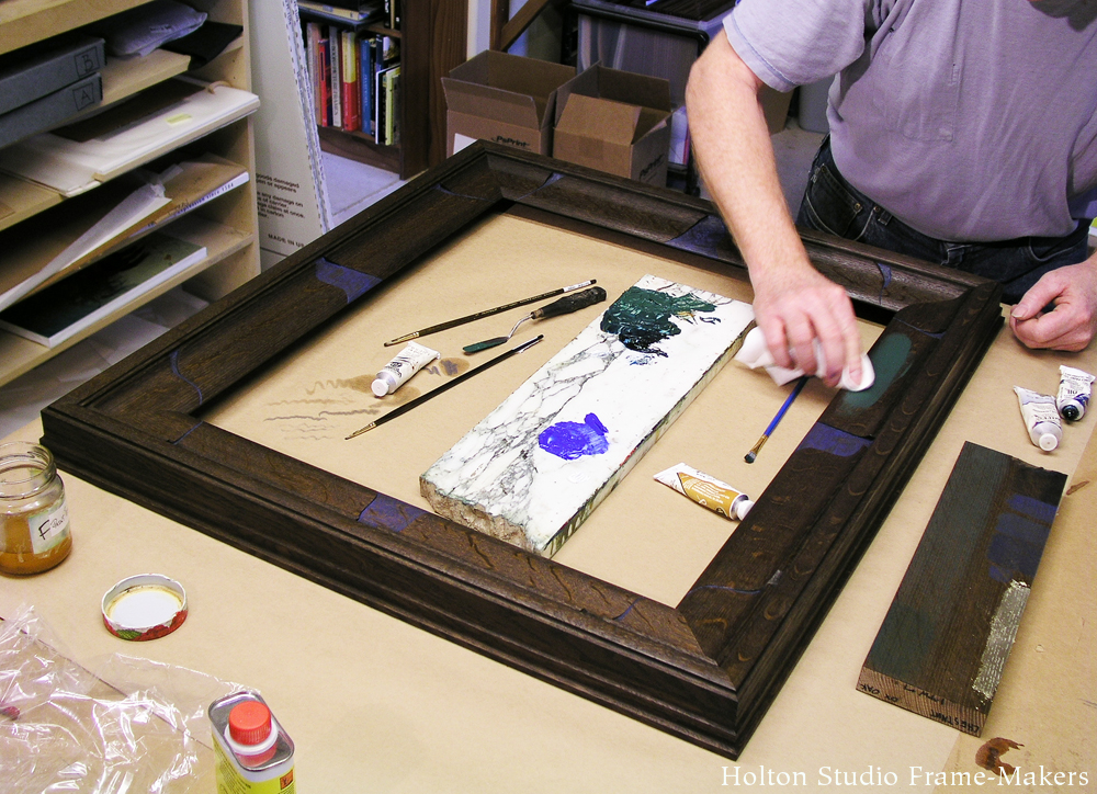 The form I chose for my frame is a reverse ogee—the “S” form, in section, of the ogee profile being the best suited to figurative work. But it also suggests waves of the sea framing the figure. So I rubbed green and blue into the oak grain, and used white gold at the crest of the wave. Framing the cove in which the scene is set are rocky cliffs painted in umbers, and so the outer cap is the natural fumed oak matching the cliffs.