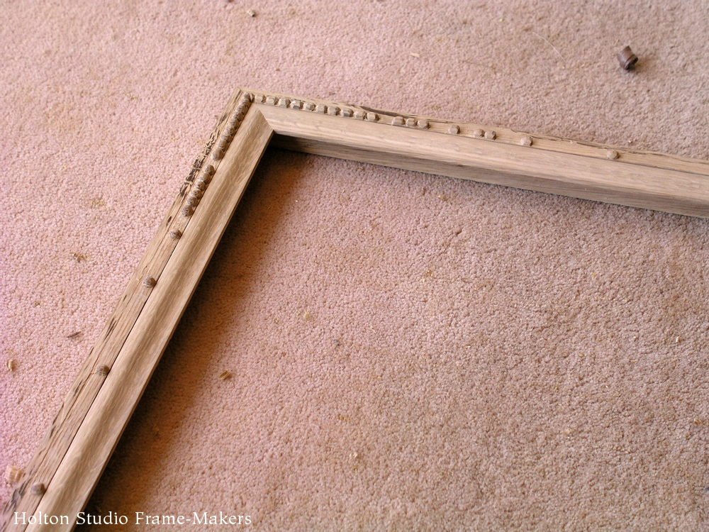 Taking my cue from Mathews’s habit of playing with traditional frame design vocabulary, I used the convention of beaded molding, but made the beads pearls behaving like sea foam as it gathers and concentrates in the corners formed by rocks. I set this off with an ogee liner, the 23 kt gold leaf rubbed through to the wood.
