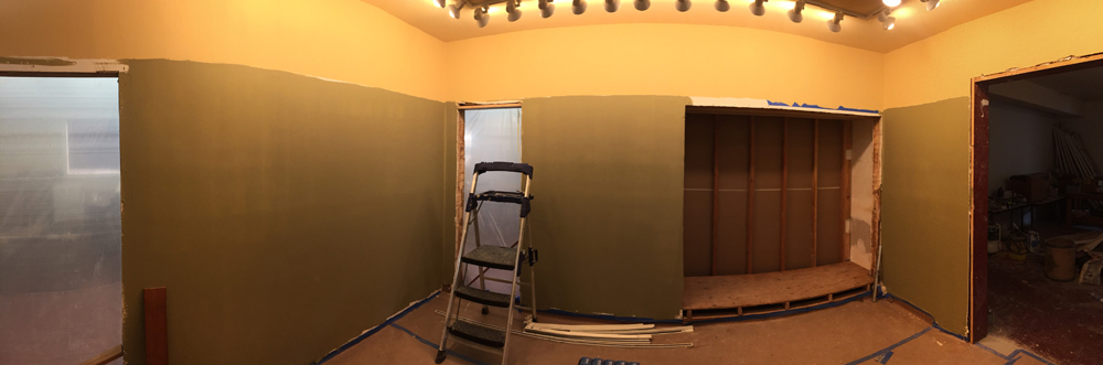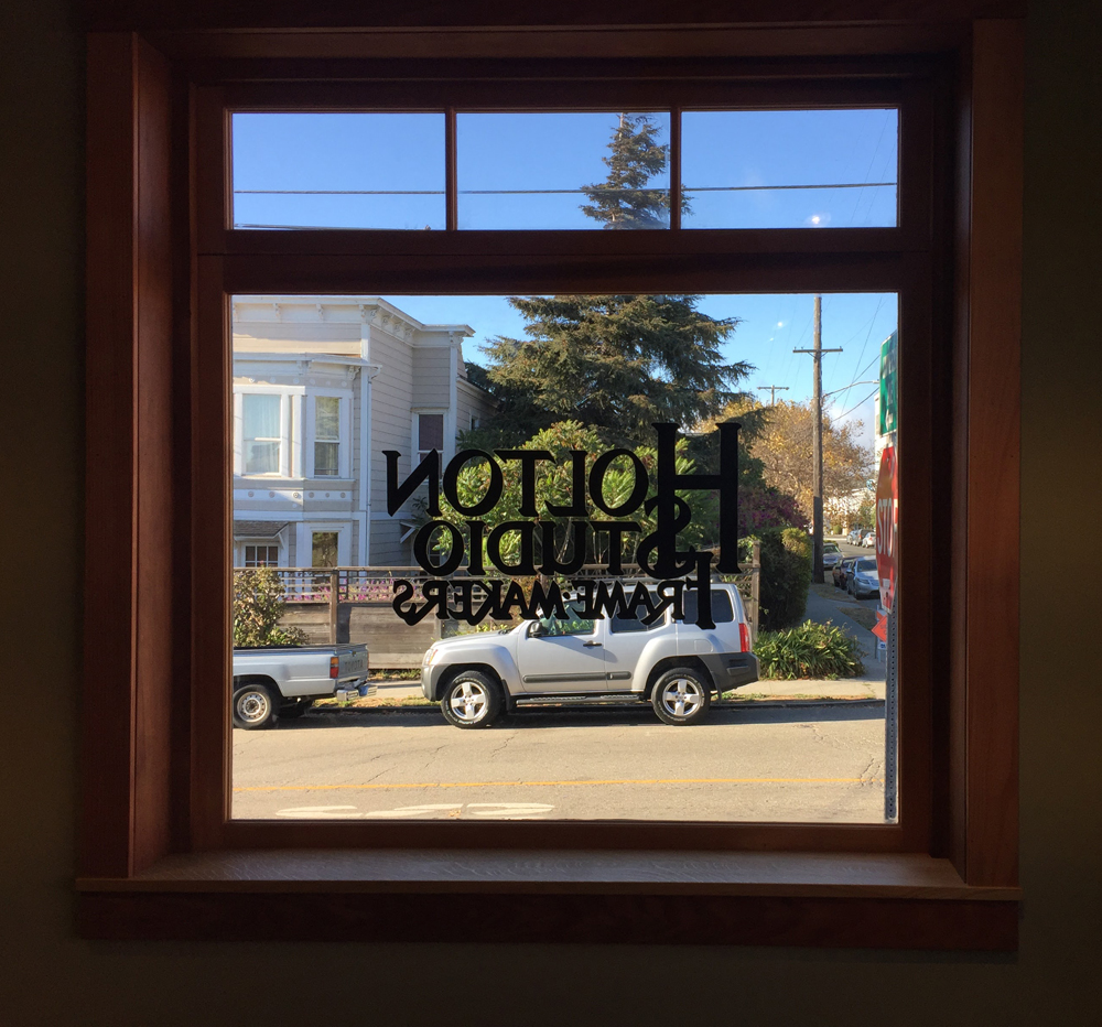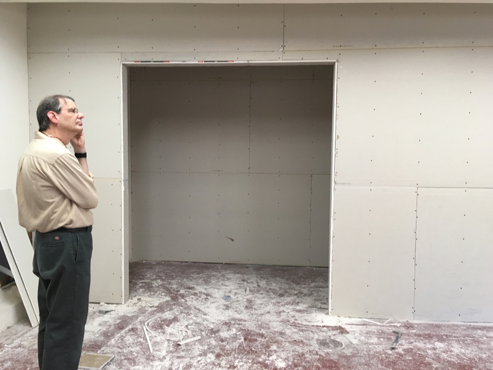 - Tim in the showroom, seen through the opening for corner sample display. Boarded up storefront is behind him.