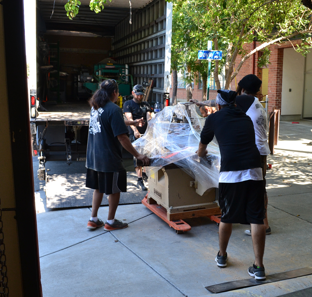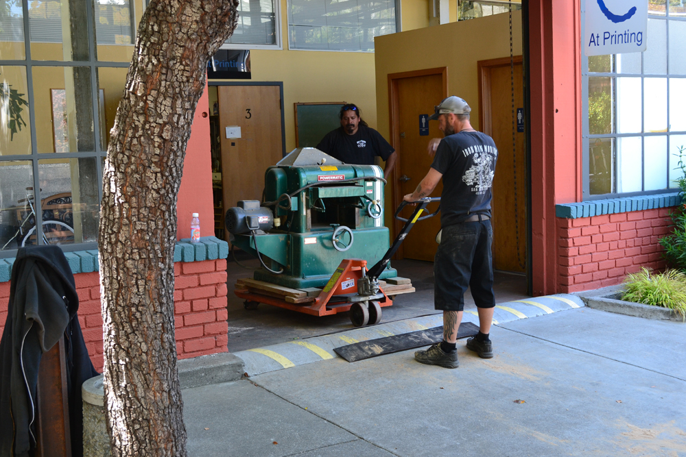 - The riggers roll the big planer out of the old shop.