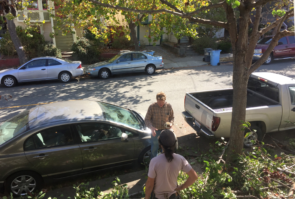 - Eric takes a pause from trimming the trees out front to talk to Tim.