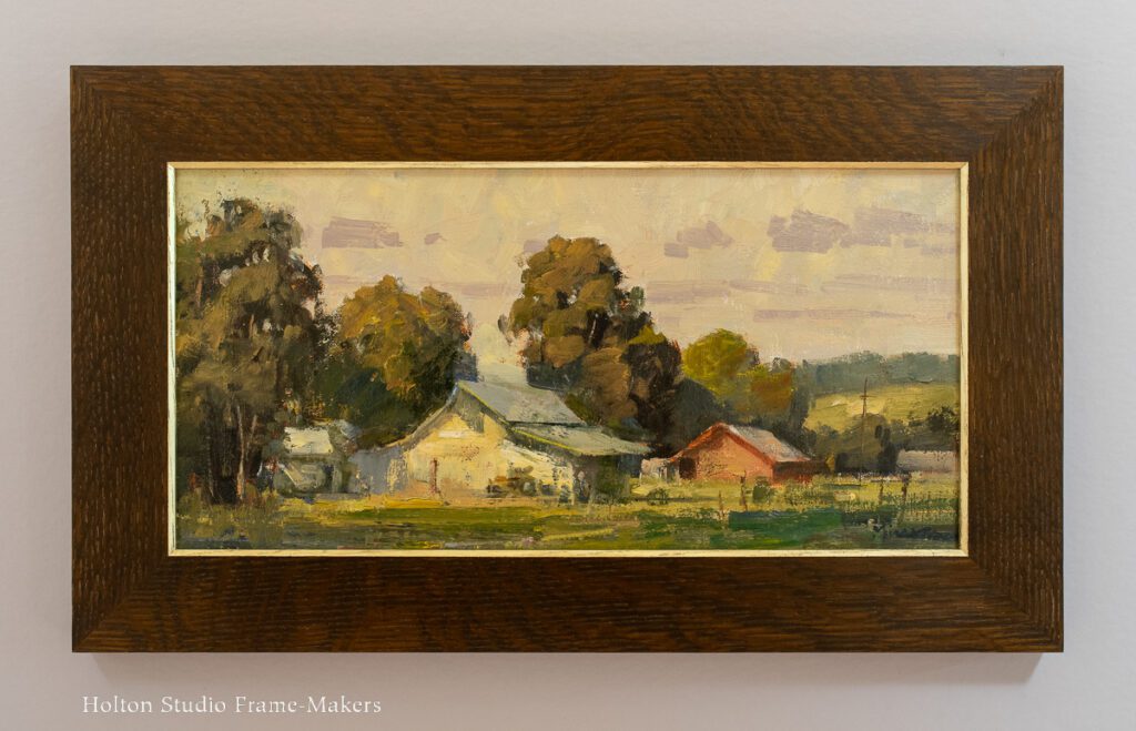 We set the 12″ x 16″ oil in a 2-1/2″ wide carved and stained quarter sawn white oak frame with a 1/8″ pale gold slip. I like how the carved texture emphasizes Terry’s brushwork, while the flat profile echoes the flat horizon.