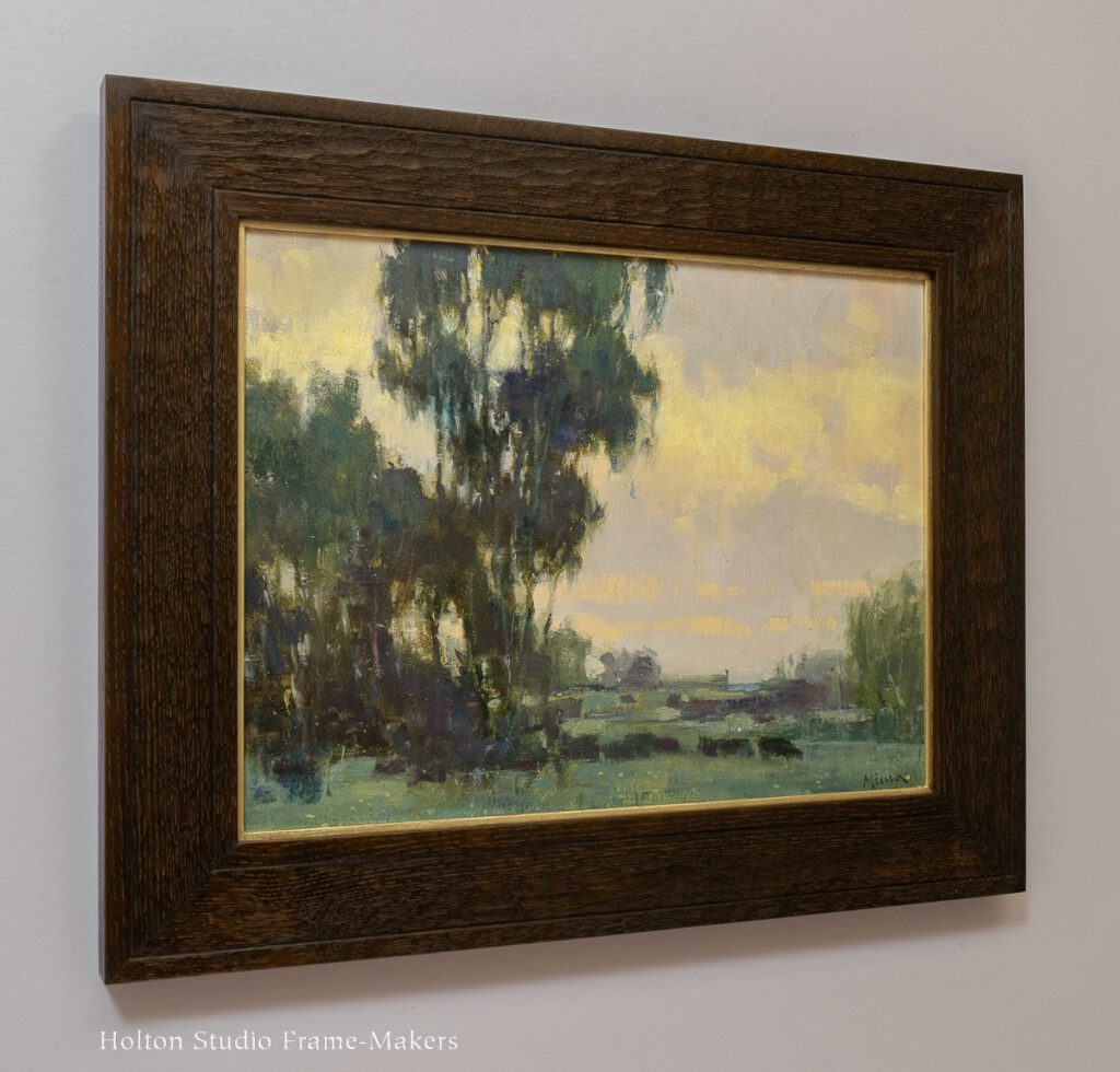 We set the 12″ x 16″ oil in a 2-1/2″ wide carved and stained quarter sawn white oak frame with a 1/8″ pale gold slip. I like how the carved texture emphasizes Terry’s brushwork, while the flat profile echoes the flat horizon.