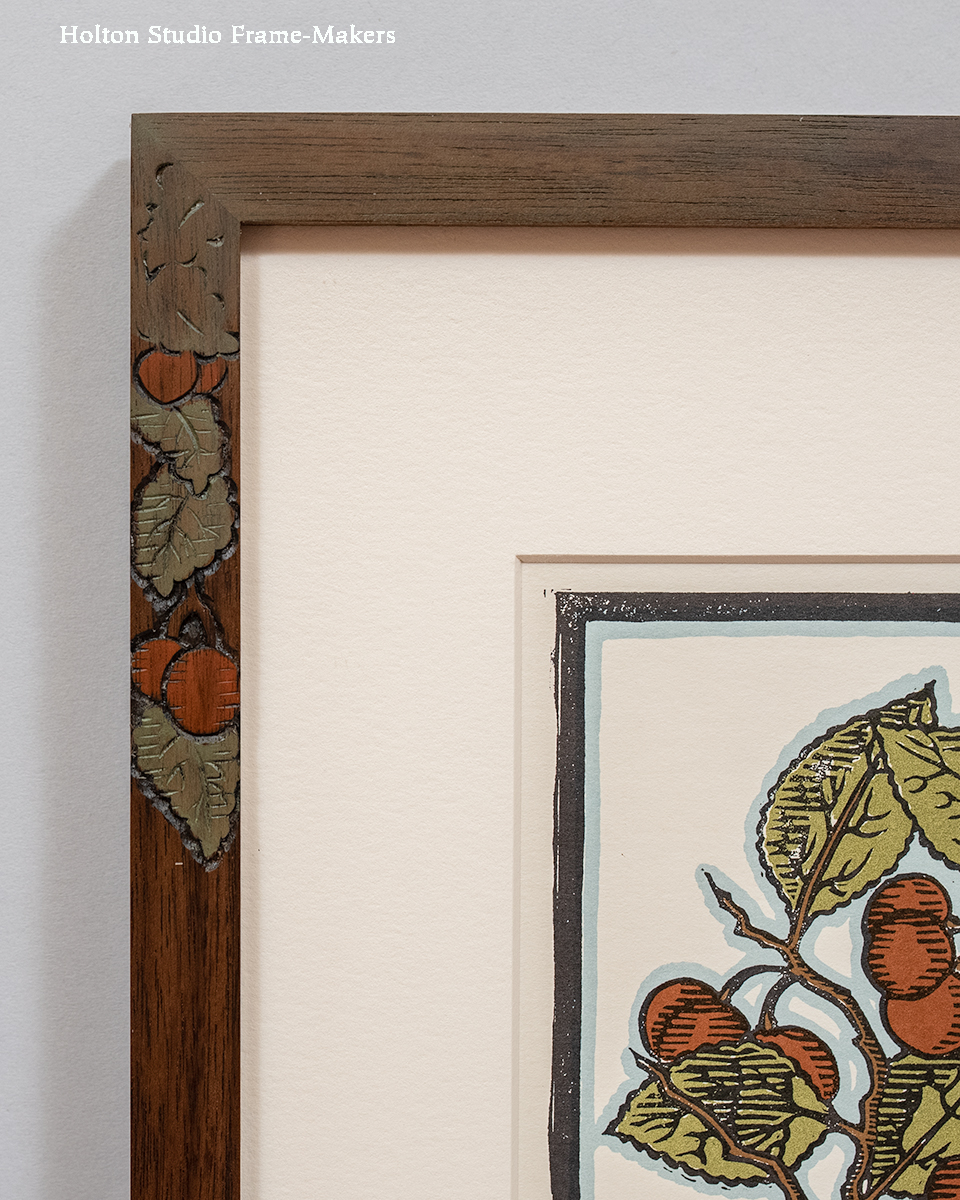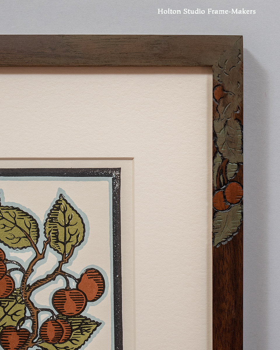 Looking for a festive recipe for your New Year’s Eve dinner? Here’s one from none other than Alice Waters, as designed, calligraphed, and printed by David Lance Goines at his St. Hieronymous Press. “Cherries Jubilee” was created in 1970 as part of a folio the pair collaborated on and called “Thirty Recipes Suitable for Framing.” The collection’s title is catnip for this framer, so in the spirit of a picture frame’s celebratory purpose—not to mention the celebratory recipe and this celebratory time of year—I repeated Goines’s lovely cherry tree woodcut design on a flat 3/4″ wide walnut frame, outlining the pattern in black milk paint and then coloring it with red and green linseed oil paint.