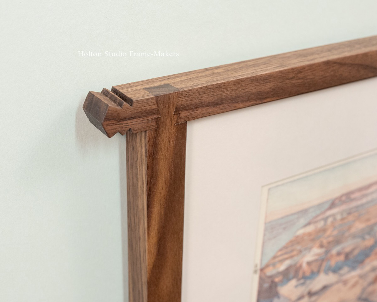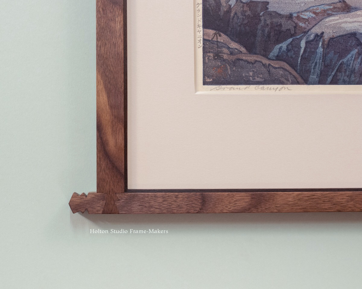 I don’t generally find the shape of a dovetail natural to picture frame joinery, at least when it’s visible on the face. But this is one instance where it felt perfect, offering a lovely way to marry the Japanese to the American Southwestern—the kind of fine wood joinery so highly developed in Japan with the patterns of Southwest Indian weaving culture, patterns that themselves resonate with the iconic geological forms and strata of the Grand Canyon, which Yoshida captured so beautifully in the print.