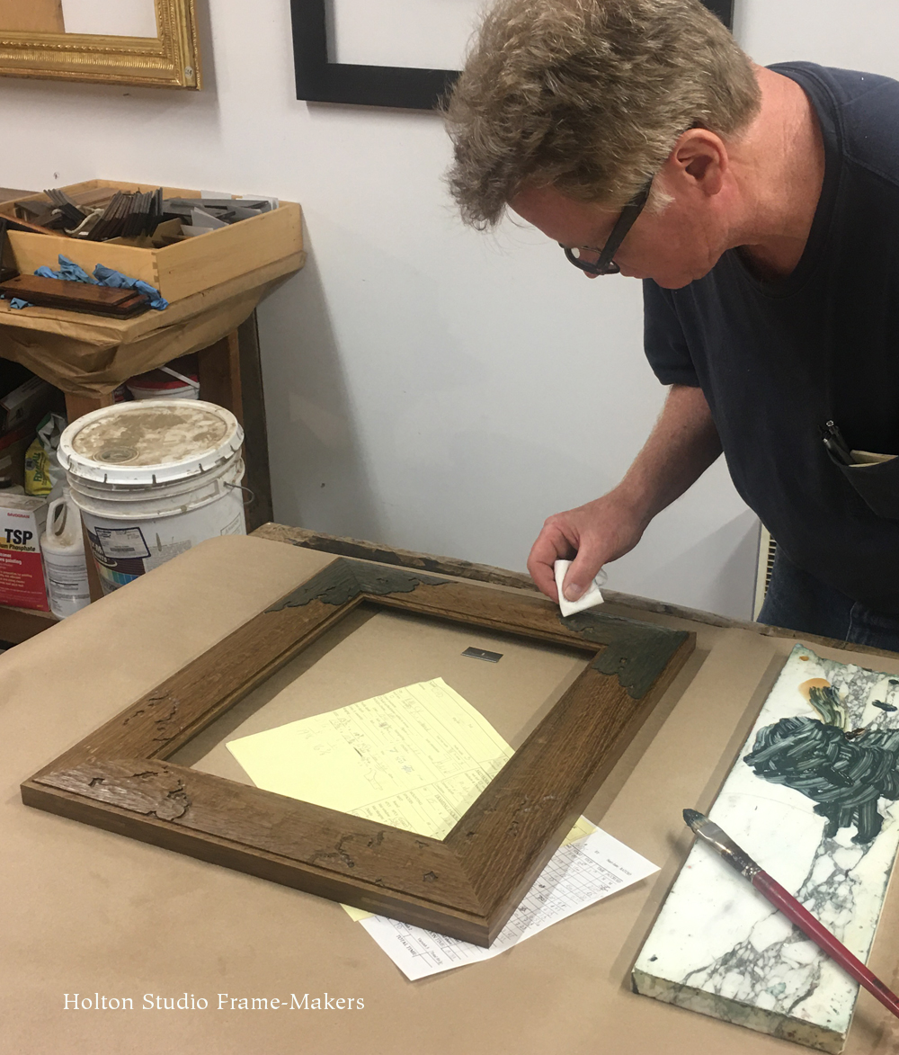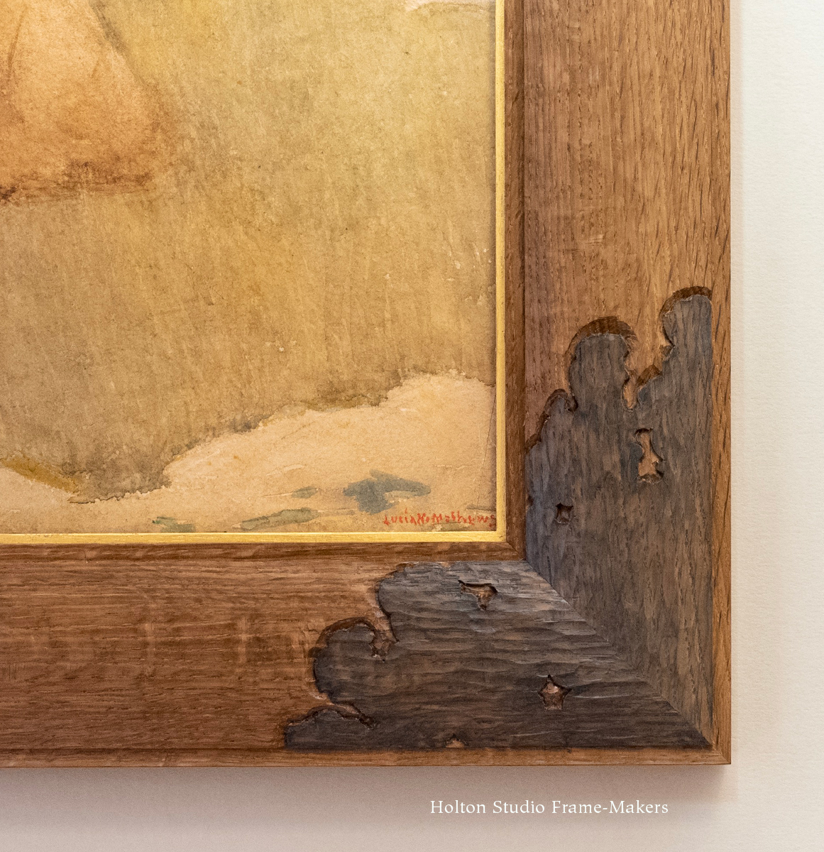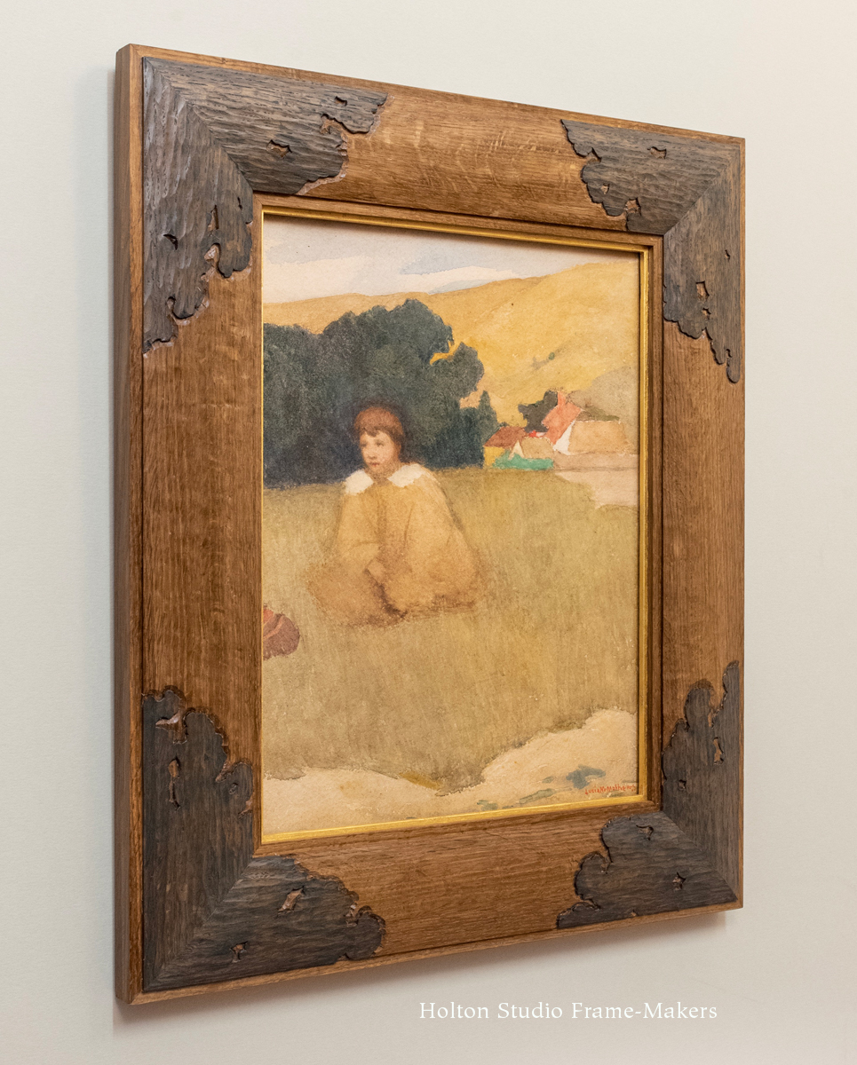 Given the outstanding quality, character and significance of Mathews frames, the rare times I’ve had their work come in to the shop, I’ve found it impossible to design the frames without channeling the Mathewses’ framing sensibilities. This doesn’t mean reproducing their frames or lifting design motifs. Rather, it’s a matter of using their sense of proportion and their method of low relief carving, often painted. I especially love their oak frames. The Lucia Mathews watercolor we framed, available through California Historical Design, cried out for an oak setting not only because the Mathewses often favored that wood (as in the example at right), but also because of the oaks in the painting’s background, as well its palette. The 3″ frame is carved quartersawn white oak (grown in the midwest, not California, unfortunately, since our state’s oaks aren’t straight enough to be used for lumber). I fumed it, which means I enclosed it in a sealed box with dishes of concentrated ammonia, exposing it to the fumes for a day or so to darken the wood to this mellow, cool brown in perfect harmony with the painting. The frame was then varnished, and finally the carved corner patterns painted green to match the oaks in the painting that frame the girl’s head.