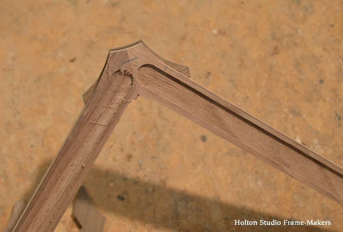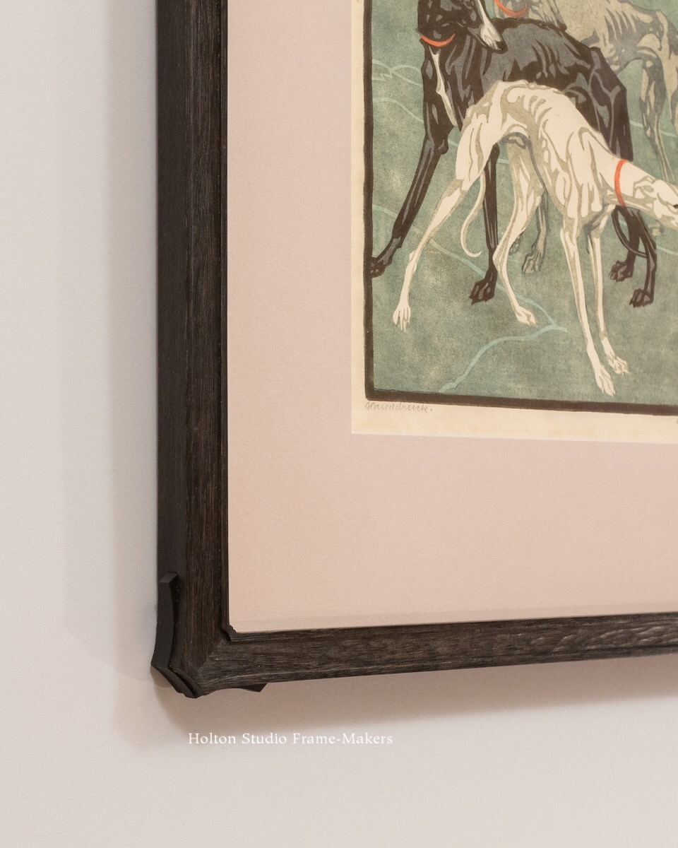 The untitled 8″ x 9-1/8″ linocut of three greyhounds is dated 1926. Bresslern-Roth beautifully captures the distinctive and characteristic visible bone structure of these creatures, and I enjoyed shaping the frame’s corners, which also have shaped proud splines, to echo that. I’d never thought about the opportunity for harmony between a picture frame and a picture of a skeletal frame (I guess I haven’t framed many skeletons). The 7/8″ wide frame is in walnut stained black. Its basic profile is our No. 14, which I often use with block prints in order to take advantage of another opportunity for harmony: the No. 14 profile is made the same way the printing block is made, with a good portion of the surface carved back to leave raised lines to ink the paper.