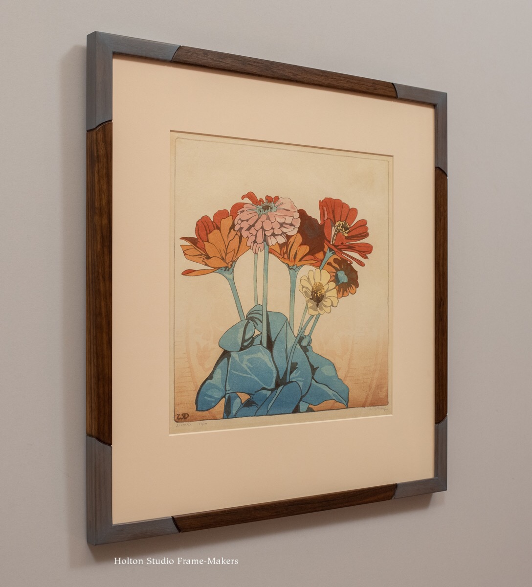 “Zinnias,” which is 10″ x 10-1/4″, is in a 3/4″ wide frame very lightly chamfered, with a carved radius near each corner echoing lines in the print; and those corners tinted blue-grey to match the leaves. (“Zinnias” is available for purchase, here.)