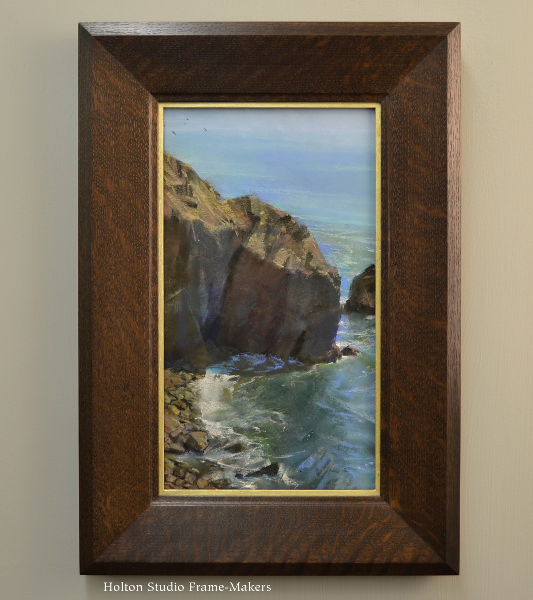 Bill Cone, “Inlet Wall,” 2010. 11″ x 12 7/8″, pastel on Canson Paper. Framed in 3” carved custom compound mitered frame in stained walnut with pale gold slip.