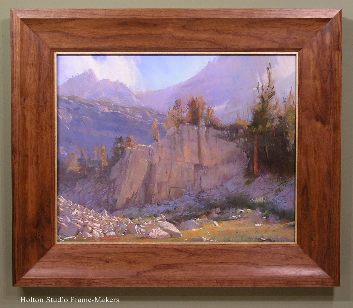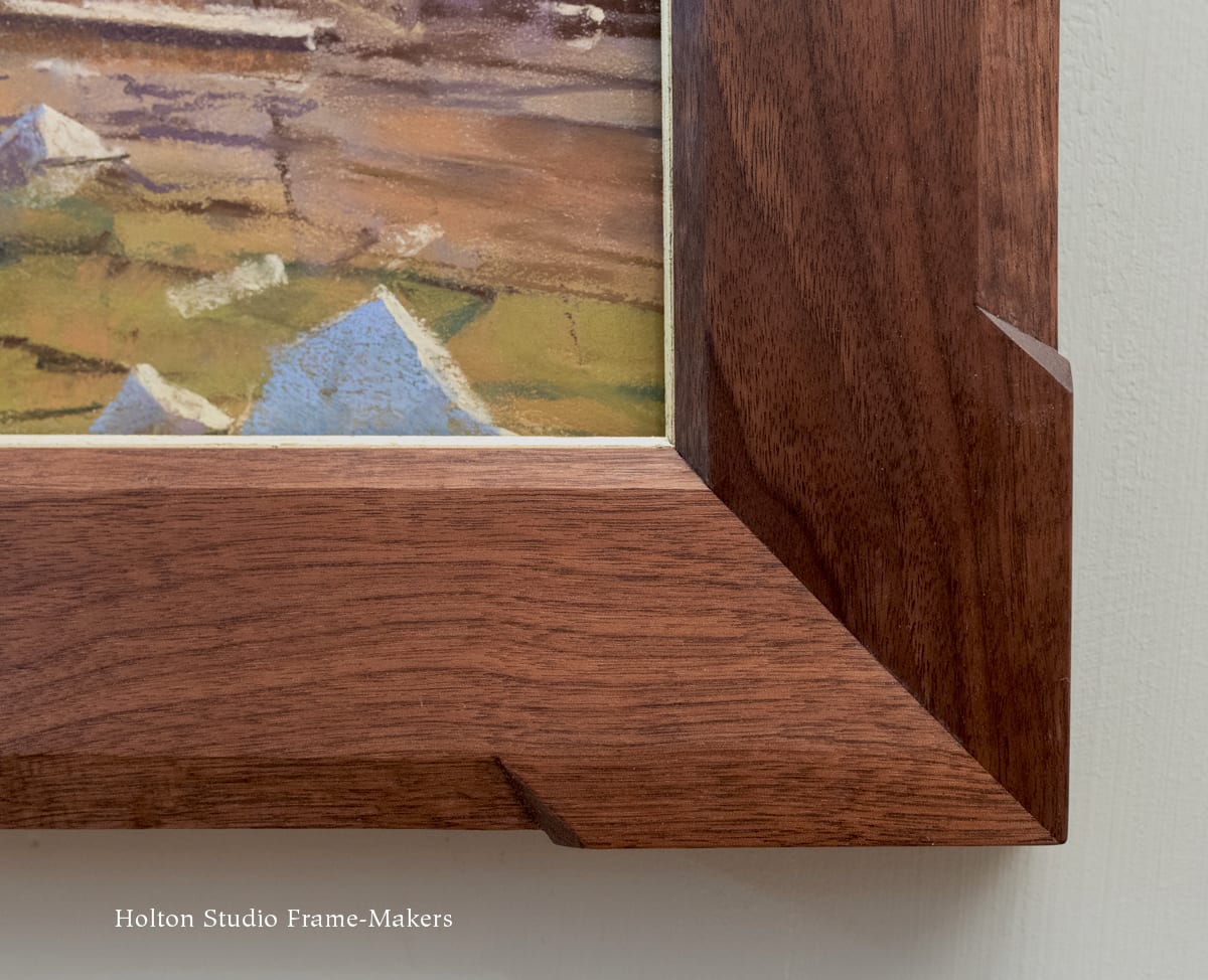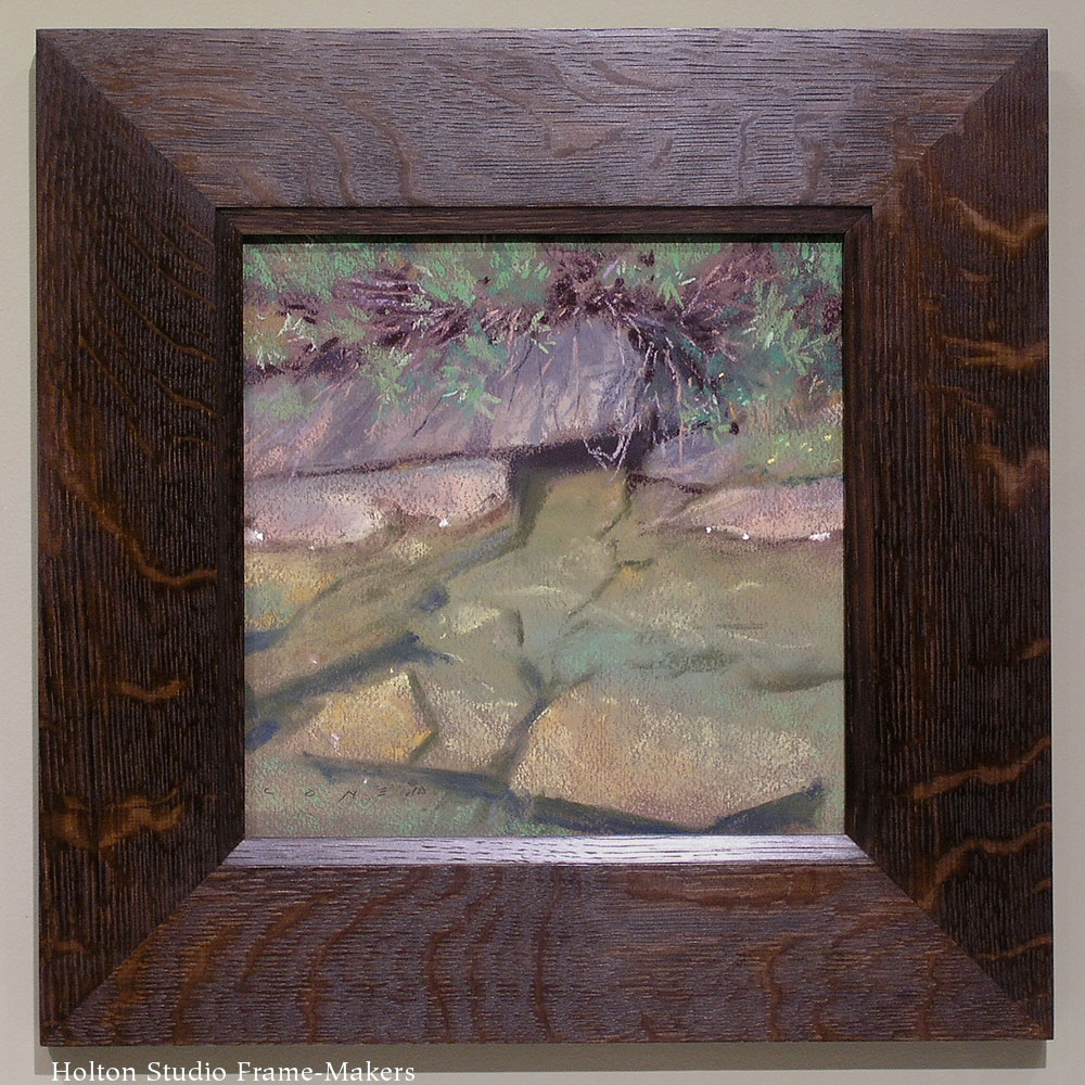 Our annual all-gallery show, “Beloved California,” opens in two weeks, and we’re down to the last few frames. So I thought I’d put up a few posts talking about the framing. We’ve been exploring some new directions, and this show offered the opportunity to apply some of that work to pictures by some premiere contemporary talents. I’m starting with the work we’re using on our postcard and other publicity, a High Sierra scene called “Chickenfoot Inlet” by nationally renowned pastel painter and Pixar Animation Studio artist, Bill Cone.