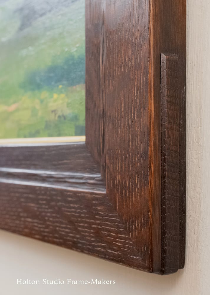 Here’s another great painting that will be in our show “Beloved California III” opening this Saturday. This one, “Spring Melody,” 11″ x 14″, is by Marin County painter, Carol Peek. We framed it in a simple 2-3/4″ stepped profile in quartersawn white oak with Medieval Oak stain and a narrow gilt slip. The steps echo the receding series of knolls. The intermediate step in the profile is carved.