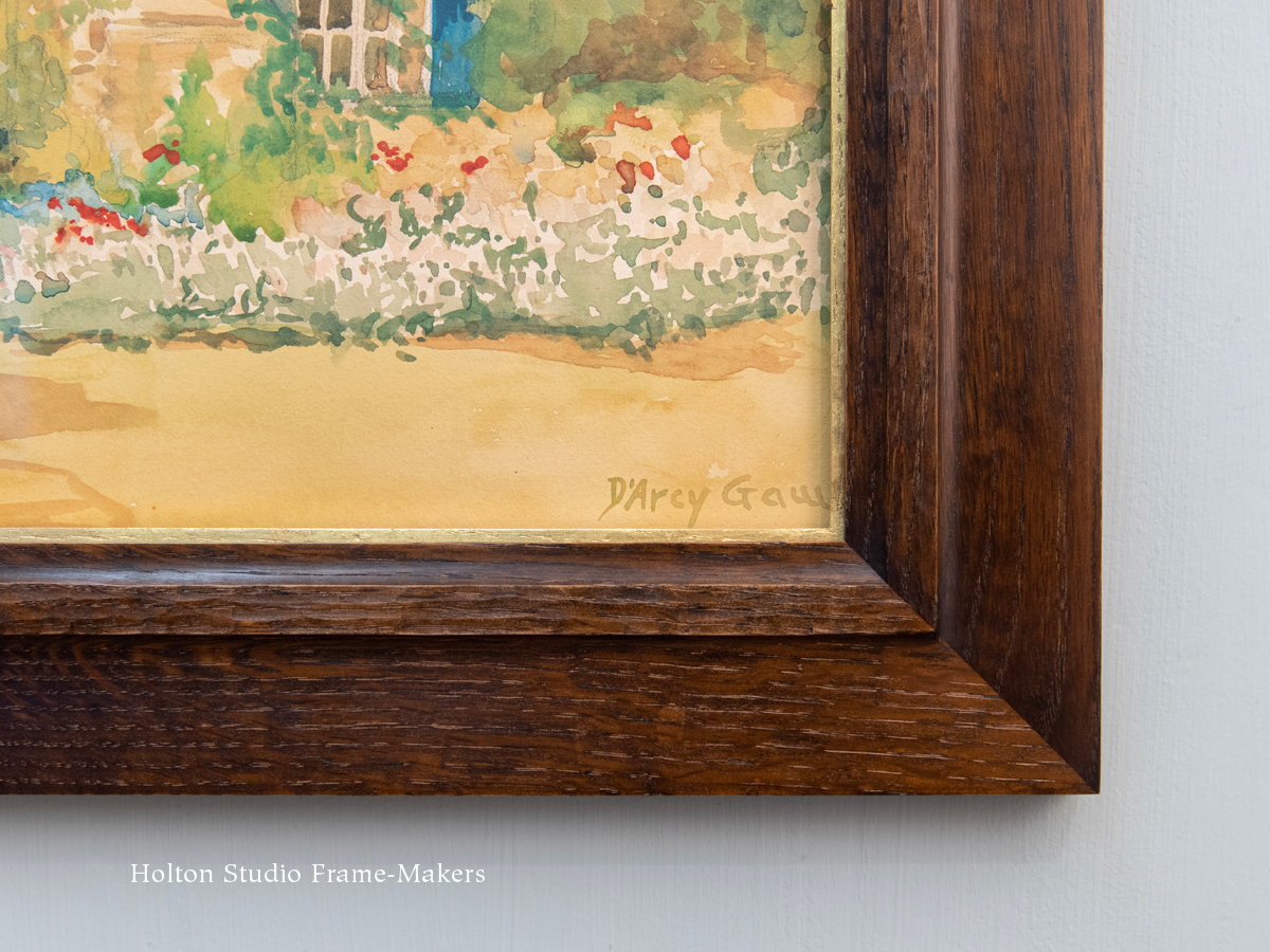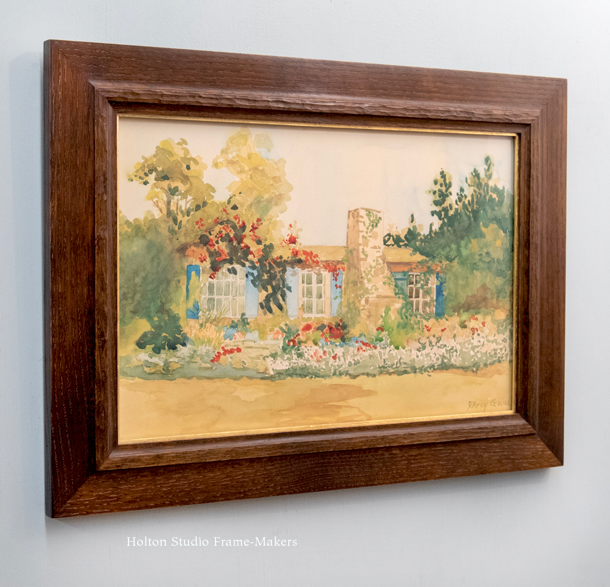 With the Robert Tetlow exhibit on display, I’m continuing my series of posts on the theme of framing watercolors with this charming 12″ x 18″ piece by D’Arcy Gaw (1868-1944), called “Carmel Cottage.” The painting is framed close in a 2-1/2″ quartersawn white oak profile with Medieval Oak stain and a gilt slip. The frame is flat and simple, with just one element: the raised, carved element designed to echo the chimney, its carved texture resonating also with the brushwork.