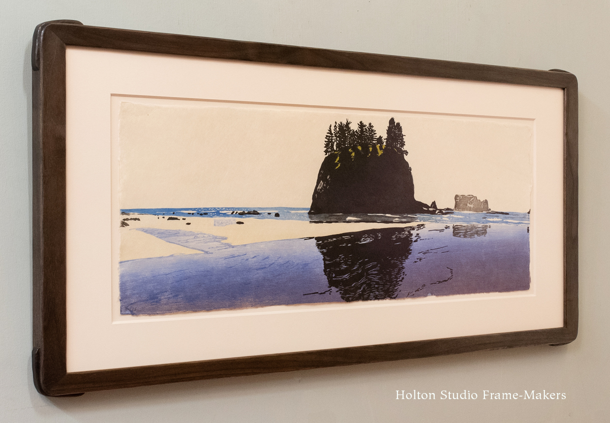 The 9-1/2″ x 26-1/2″ print “La Push,” above, is very similarly framed, but the rugged forms and their rough and irregular edges seemed to me to call for some carving. So the frame, otherwise flat, has carved inner and outer edges, and the shaped proud splines are also carved. The top and bottom members are 7/8″ wide, the sides 1-1/4″.