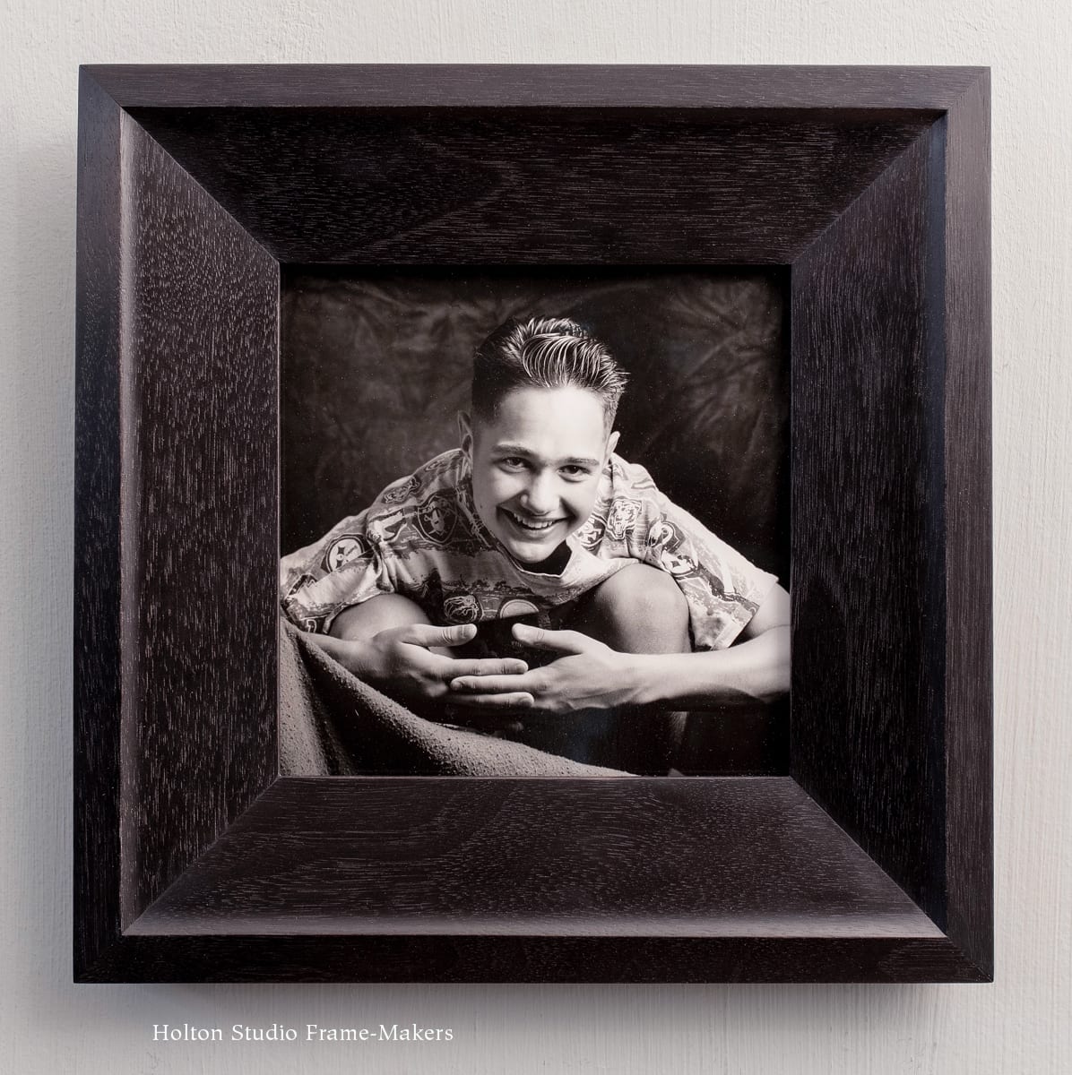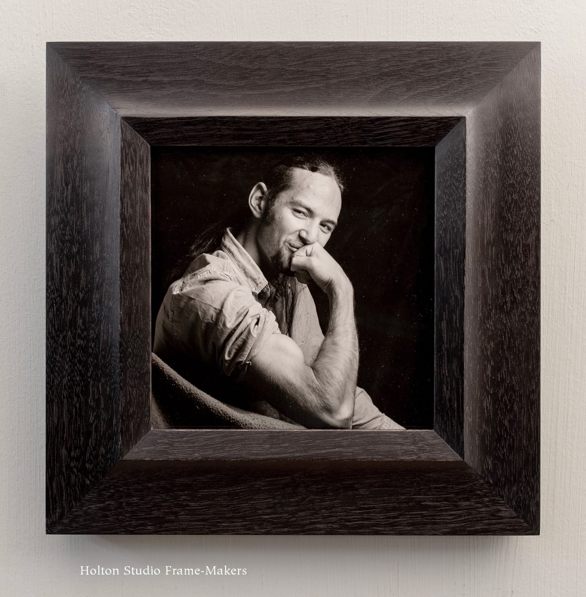 The photos in this set are framed “close” —i.e., with no visible mat (a hidden, or “gasket” mat, separates the picture from the glass)— in 2-1/4″ walnut frames stained black. When I get the chance to frame sets of companion pictures, no matter what medium, I usually prefer the frames also to be similar but different—usually in the same wood and, if they’re the same size, same profile width. (Another good example of that is the Barbara Tapp show we had at the Gallery earlier this year, in which all the frames were in clear walnut and 2″ wide.) That’s what we did here, with all the frames the same width and wood and finish, and in a consistent genre, but keying the shape of the frame to the particular characteristics of each photo, and each photo reflecting in turn the individuality of each subject. The frames, like the subjects, are members of one family, but each unique.
