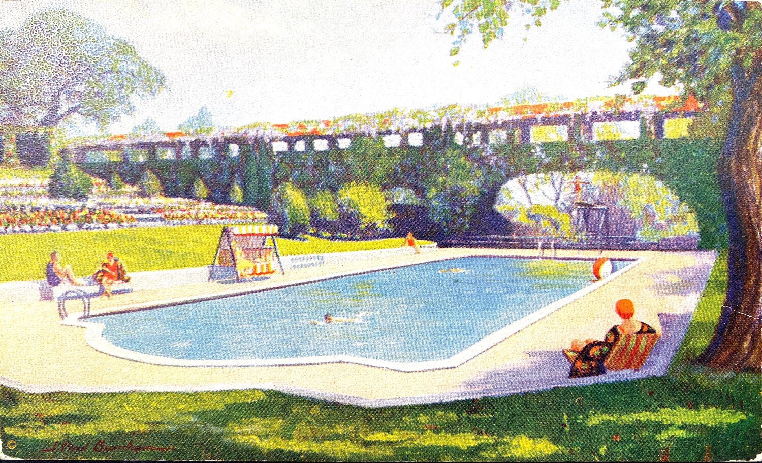 Forty-one of Moore’s paintings are very handsomely framed by the historic bridge at the Langham Huntington Hotel in Pasadena. The so-called “picture bridge” was restored a few years ago. One of the paintings, shown at right as featured on a postcard, includes eucalyptus trees Moore treated in a similar manner to those in the painting above. More images of the bridge are below—the first image showing the bridge today, and two more period postcards.