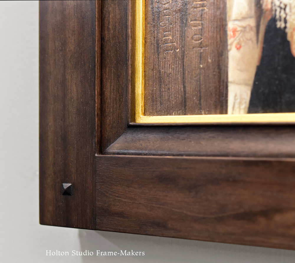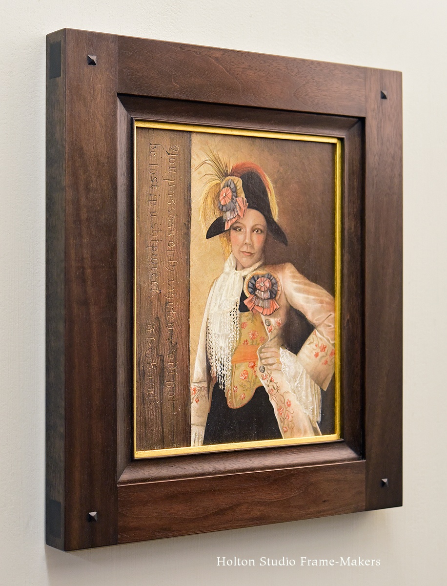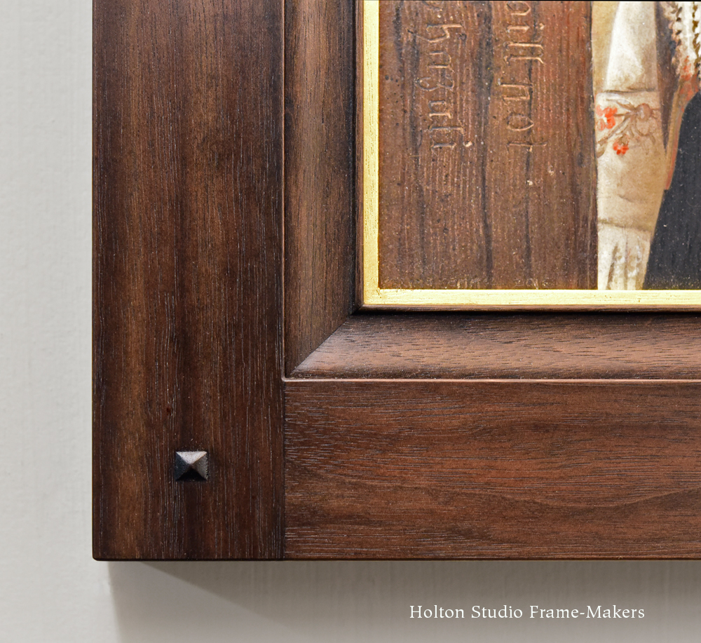 These were so much fun to frame because of the imagery’s embrace of architecture and the decorative arts—the realm of the picture frame. In this one, a self-portrait (thought we’d start by introducing the artist herself), the figure is standing next to a wooden post. This architectural element became the most obvious cue for the architecture of the frame. Thus, we went with a mortise-and-tenon design, our No. 1000 “Basic Aurora”, in a 1-3/4″ wide profile. (Notice in the angled view below the flush through-tenons, which add to the architectural feel of the frame.) But at the same time, the painting’s fine rendering called for a more refined form in the frame, so we chose a mitered liner in our No. 508—7/8″, an ogee shape—always a good choice for tightly rendered figurative pictures. (Total profile width is 2-1/2″.) The fine bead on its sight edge works with the fine detail in the painting. Walnut was the obvious choice for color and suitable degree of refinement. We stained it to harmonize with the background shadows, so that the frame would be a shadow tone effectively spotlighting the painting. A 1/8″ gilt slip provides emphasis and definition to the picture. I’m pleased with how the frame answers the problem of balancing these two complementary elements—the harder and architectural, on the one hand, and the softer, figurative and decorative on the other.