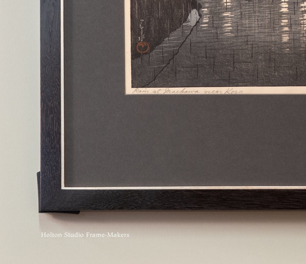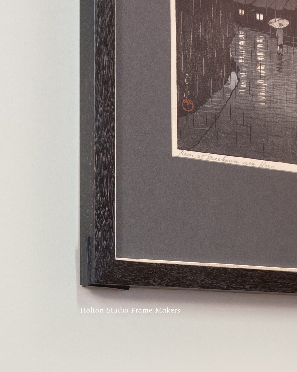 Just finished this beautiful woodblock nocturne by the great shin hanga printmaker Kawase Hasui (1883-1957), and am very pleased with it. The oban size print (14-1/4″ x 9-3/8″), dated 1932, is titled “Rain at Maekawa Near Kozu.” I played some more here with proud splines. Looking to the architecture in the print for something to echo in the architecture of the frame, the shape of the thatched roofs caught my fancy, thus the shape of the splines. Otherwise, the frame is simple as can be—just a 1″ wide No. 1 in walnut stained Black. Oh—and an 1/8″ white gold slip to answer the light in the windows. The frame being itself a window, I guess that’s a second reference to the architecture. The mat is a very dark grey solid core rag mat. (Two other recent posts on framing Hasui are here and here.)