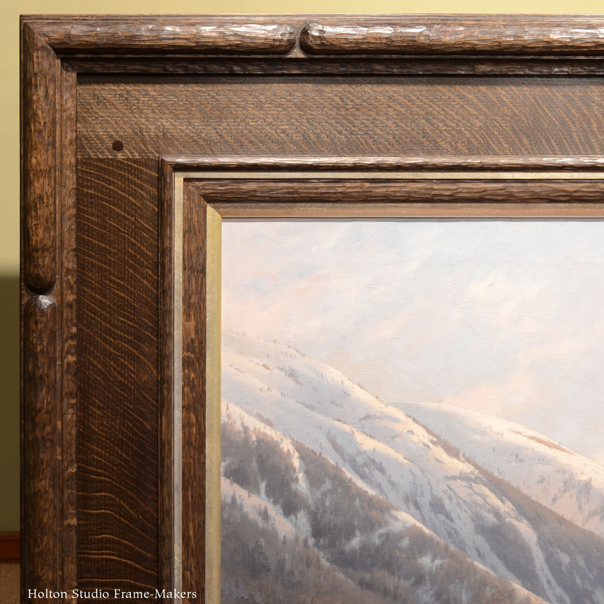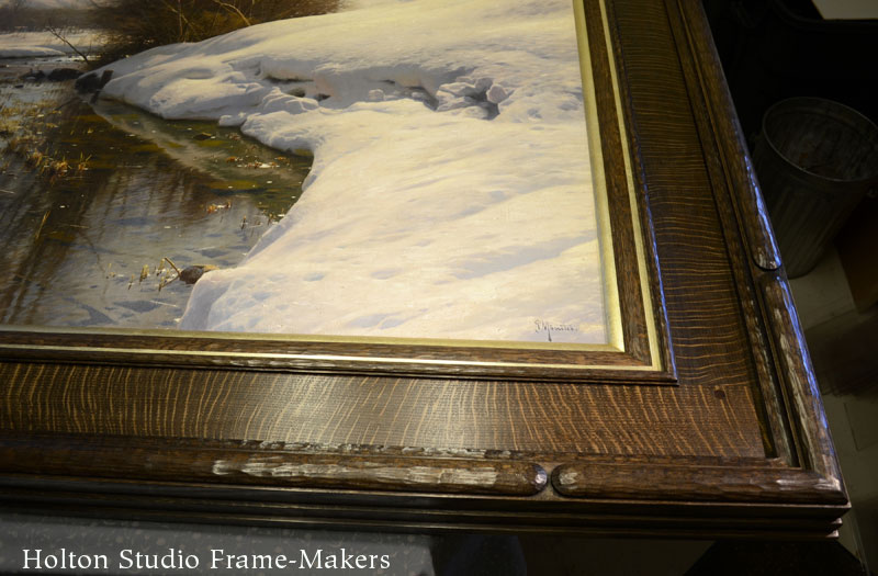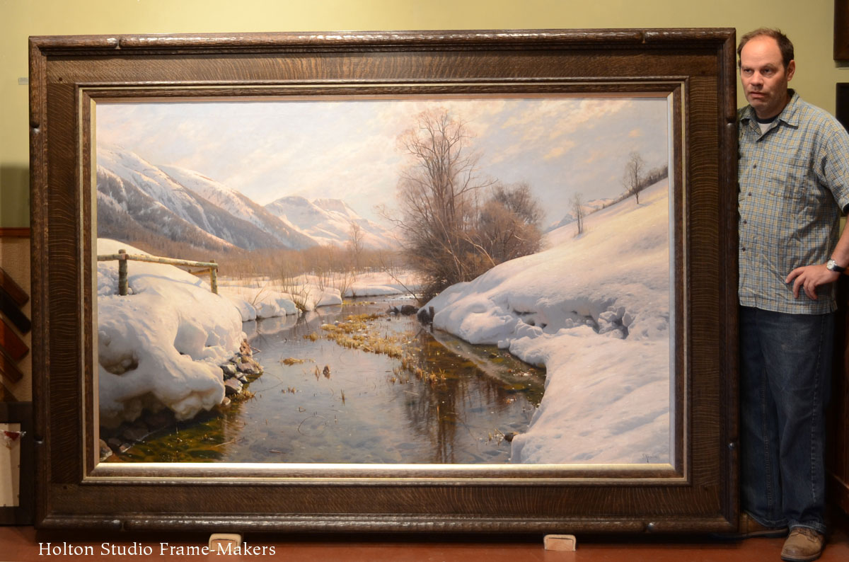 I’m very behind on blogging on some of the great jobs we’ve done over the past months. Here’s a spectacular winter scene—the Peder Monsted I showed the frame for on my Jan. 2 post and promised then to write about soon. Monsted was a Danish painter, born 1859 and died 1941. This work is “La Punt near St. Moritz, Engadin Valley,” 1919. Oil on canvas, 50-1/2″ x 79″. Framed in carved Cassetta—10″ total width, in quartersawn white oak (Dark Weathered Oak stain), with slip and insert in white gold-leafed oak.