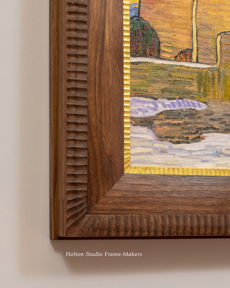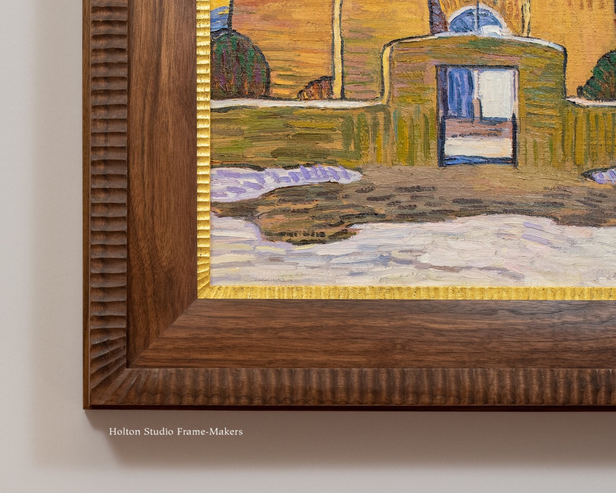 We just framed this painting of San Francisco de Asis Mission Church in Taos, New Mexico by Robert Daughters (1929-2013). We set the 15″ x 15″ “Taos Church” (n.d.) in a 3″ compound mitered frame with carved flutes cut across the grain on the cushion-shaped cap molding and the gilded liner. The 2″ intermediate molding is an (uncarved) low cushion. Sam finished the walnut frame with linseed oil and wax.
