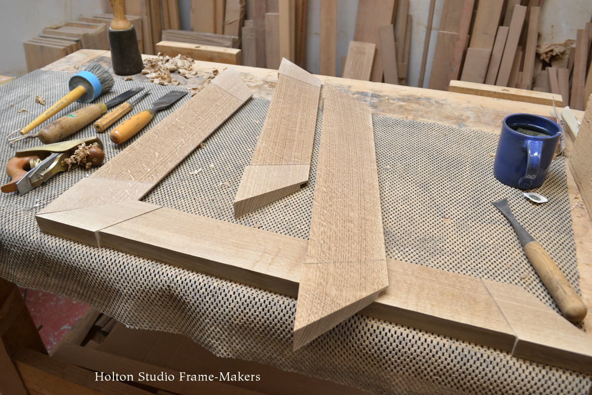 the third one below, the outset corners are on the narrower mitered inner molding that’s set inside a plain mortise-and-tenon flat. All are quartersawn white oak. All three are available through California Historical Design in Alameda.