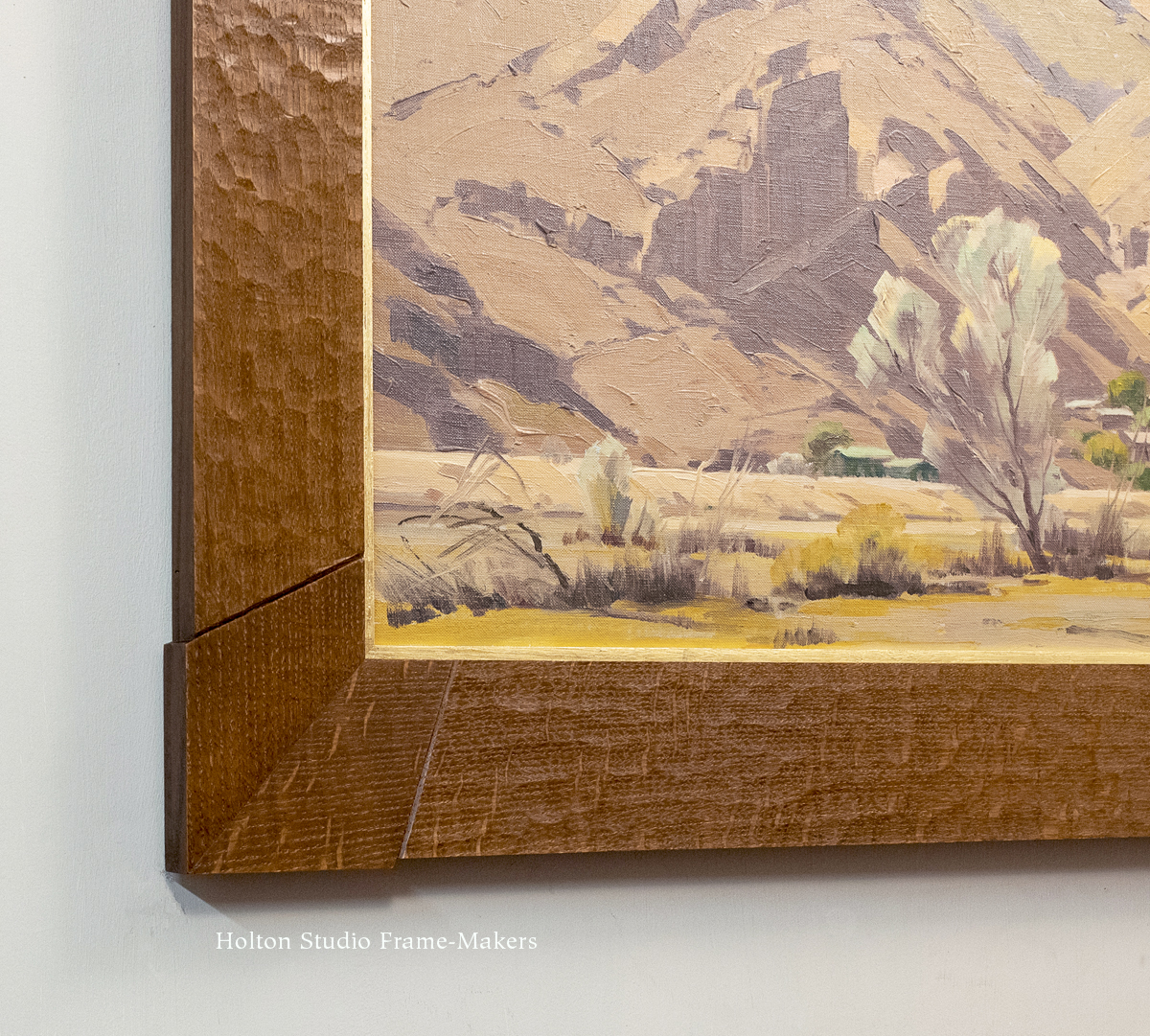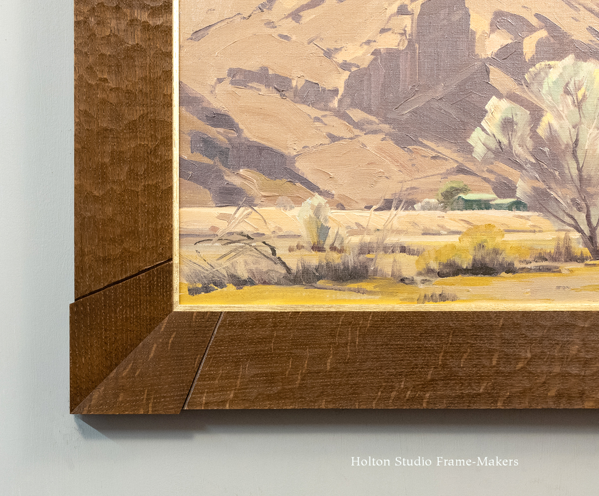 Below: “Enclave” n.d. Oil on board, 17-1/4″ x 23-1/4″. The compound Aurora—No. 1000 with a sight edge mitered frame in a cushion profile with outset corners. The profile is 3-1/2″ wide.