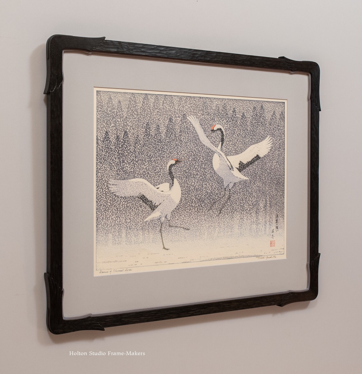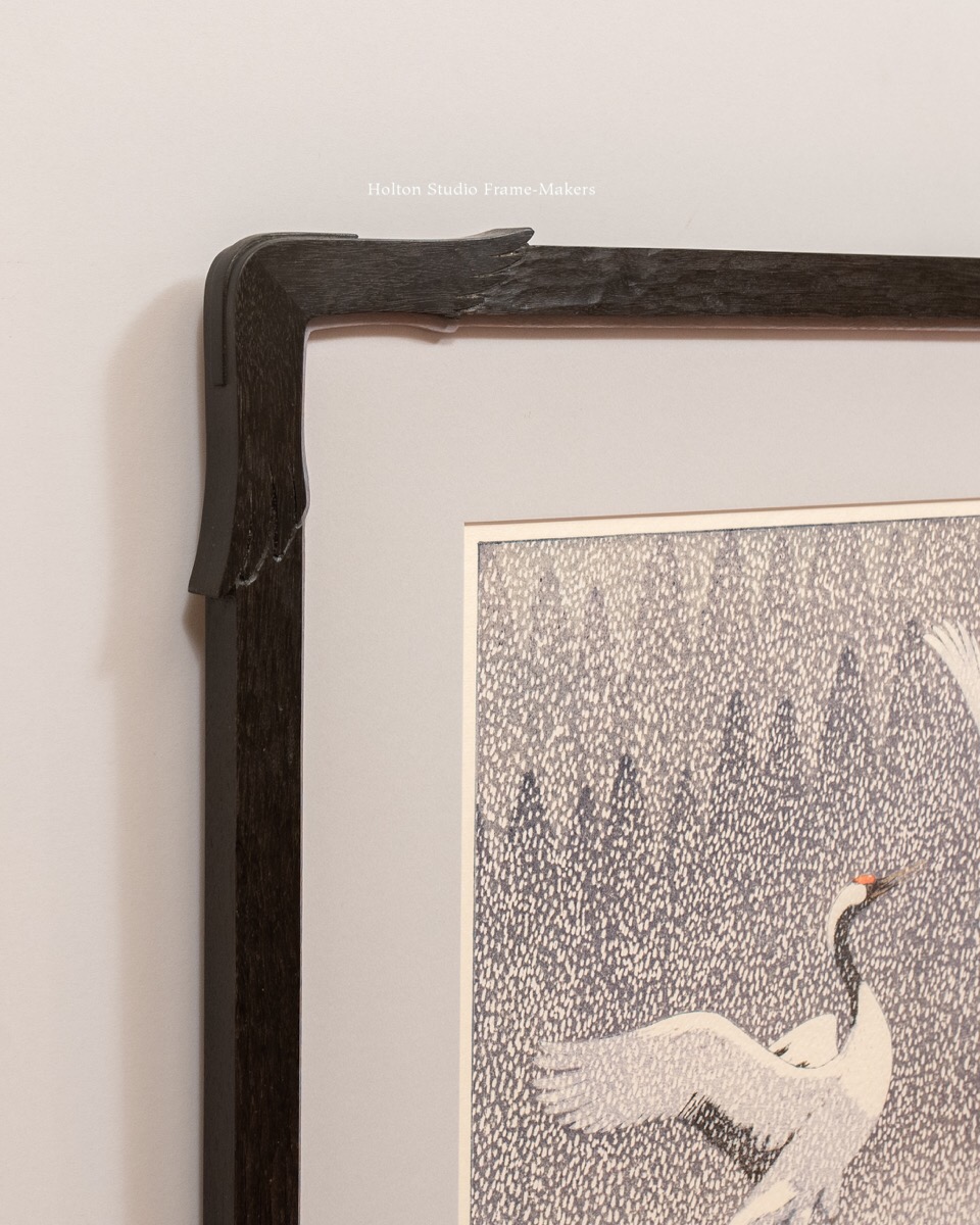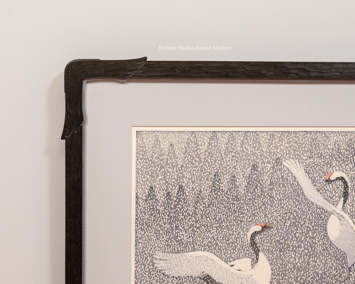 This rare large (13″ x 17-1/2″) woodblock print made by Toshi Yoshida in 1994, “Dance of Eternal Love,” is an extraordinary and inspired image which my customer and I saw fit to play up in the framing by adapting the form of the expressively spread wings to adorn the corners. Those shaped corners of the 7/8″ wide black-stained walnut frame, which is about 21″ x 25″ overall, also have proud splines. Like several frames posted lately, this one has a painted slip, in this case in a grey lilac keyed to the print, and the slip is shaped to follow the lines of the frame.