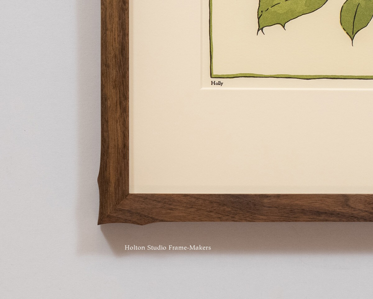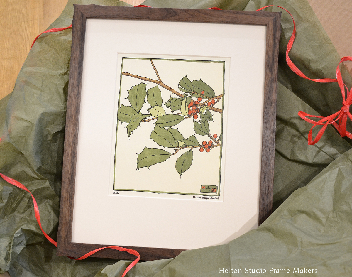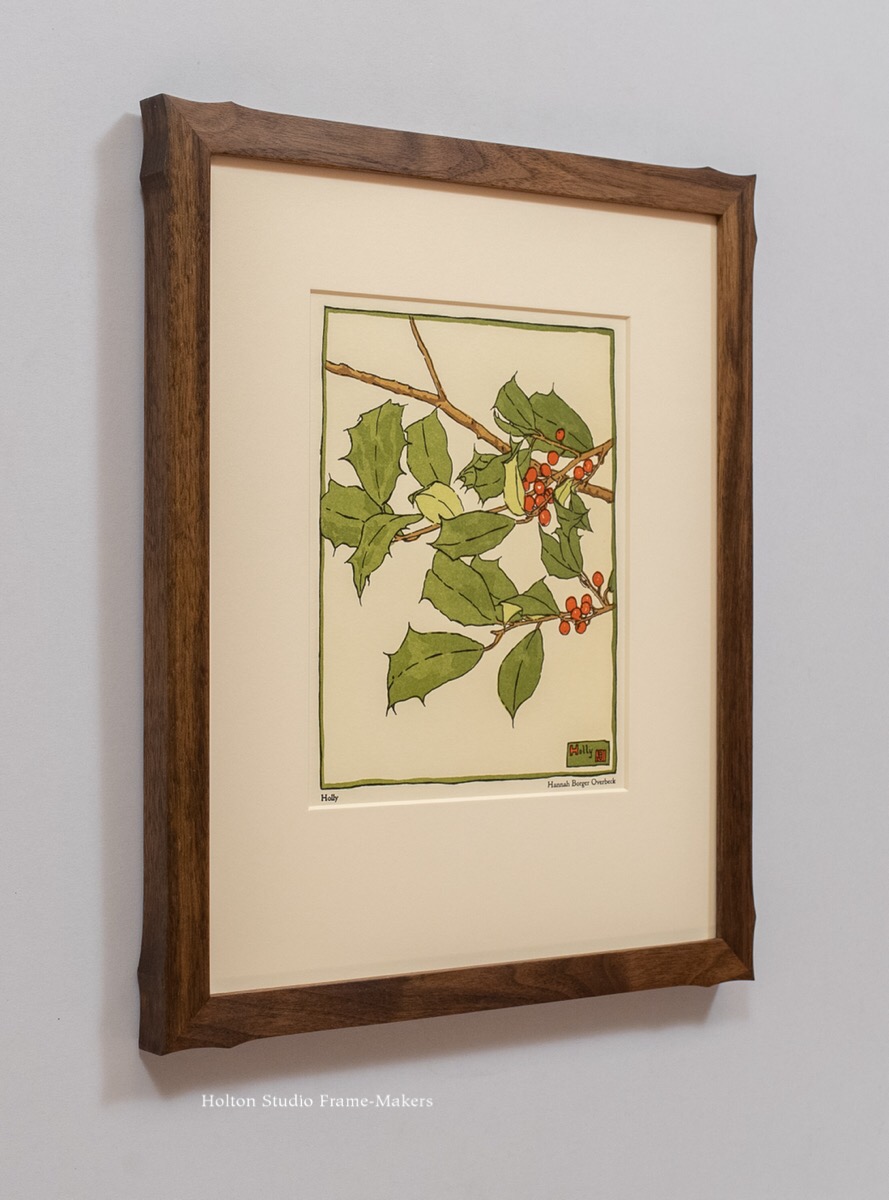 This one, “Holly,” is based on a circa 1915 watercolor and ink drawing in the Los Angeles County Museum, shown at right. (In typical humble fashion, Yoshiko dutifully included the Overbeck name on the prints and did not see fit to sign it herself. It is, nonetheless, a true block print made by Yoshiko.) This holly print (7-1/2″ x 6″ image size, 13-1/2″ x 11″ outside frame dimensions) is one we just had to frame up to offer for the holidays this year. I shaped the corners of the walnut frame to echo the holly leaves. Archivally framed in a cream colored rag mat and Museum Glass. $350.