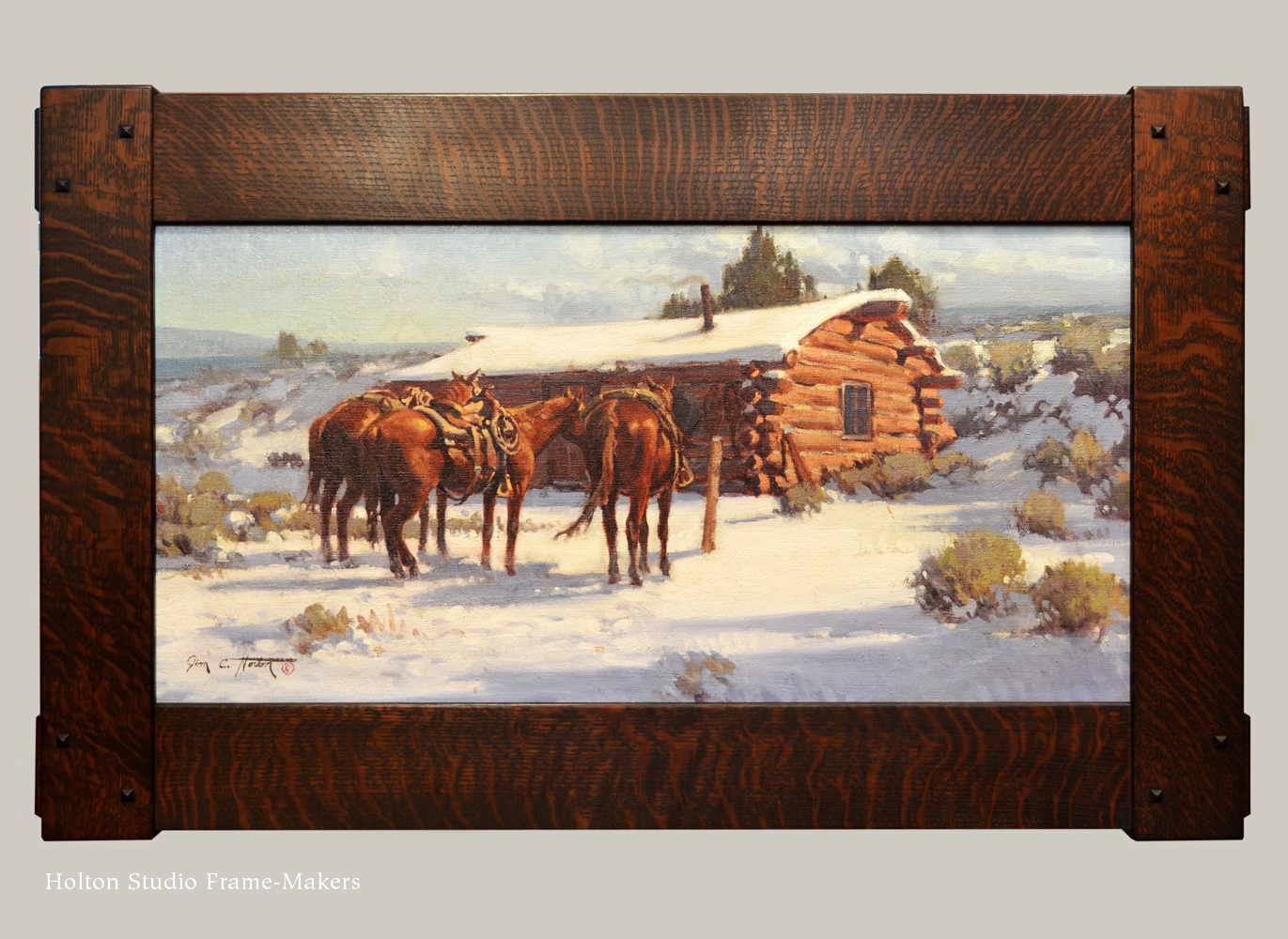 - Jim C. Norton (b. 1953), untitled (horses and log cabin), n.d. Oil on canvas, 15 x 30.