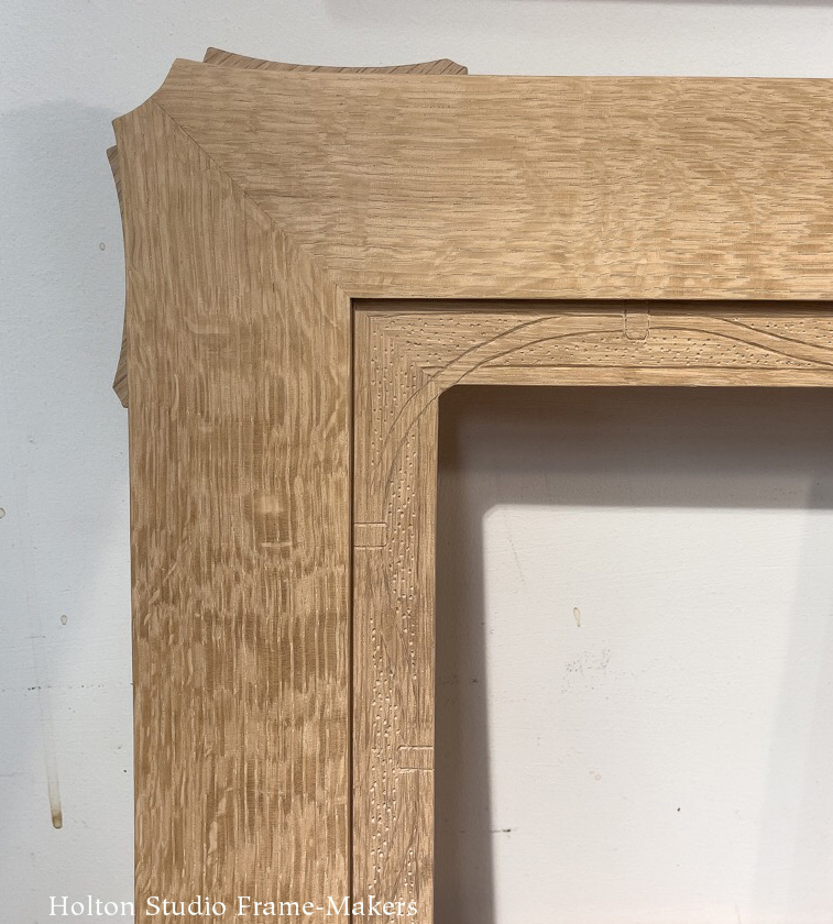 Such a work of imagination pushed my own creativity. I got a good nudge from the frame actually depicted in the painting: the decorative brass border around a ship’s porthole. (A picture is a window; sometimes it’s a porthole.) From that I came up with the carved 1″ wide bronze powder-rubbed liner. Attempting Ćeran’s masterful knot work would have been foolhardy, and too busy in any case. But a simplified pattern, a serpentine band quietly winding all the way around to resonate with the picture’s subject, felt right.The carving is flat rather than in relief, the pattern simply outlined with a v-shaped carving tool (v-tool) and the background stippled.