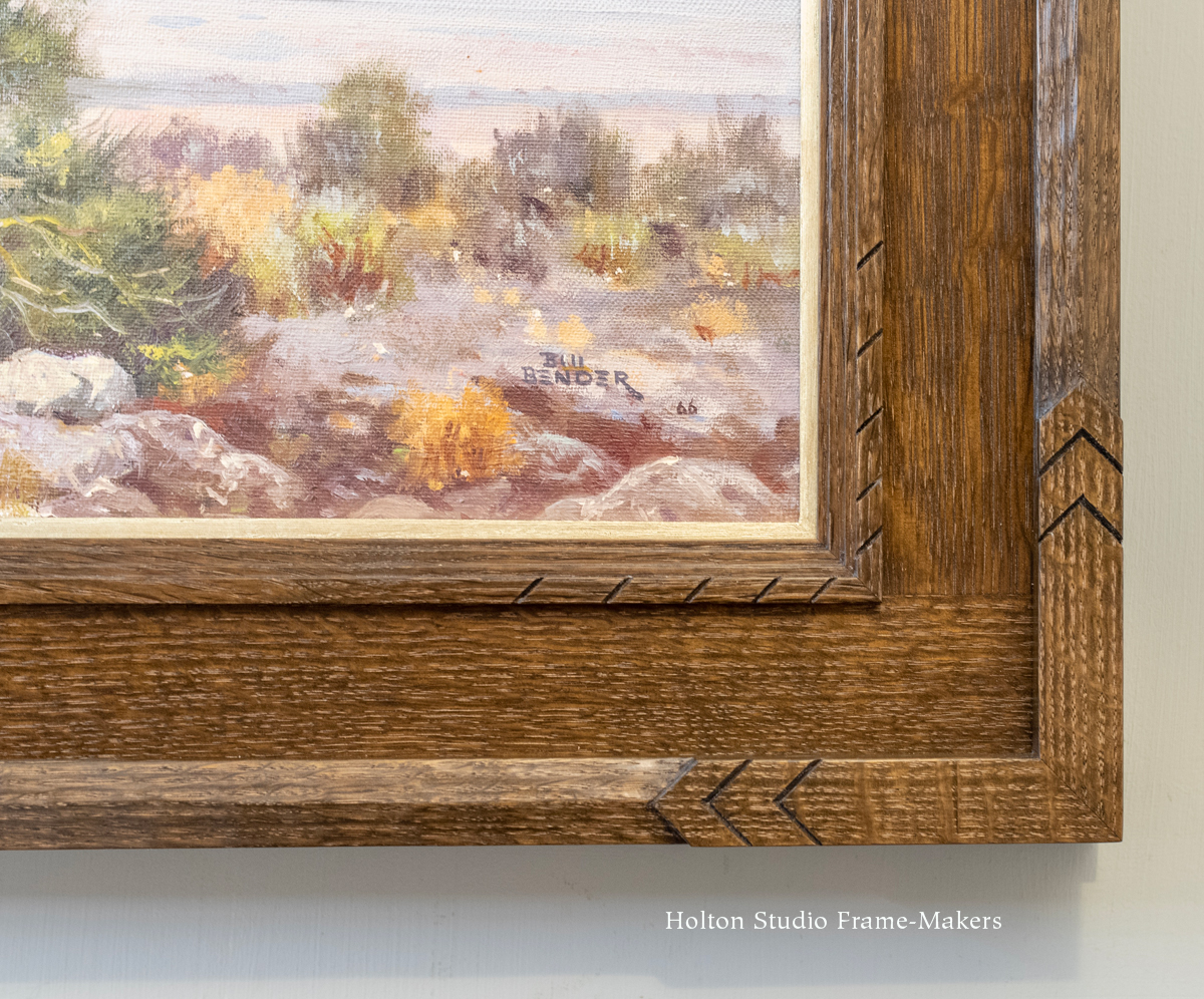 The second painting, which came to us as shown at right, in a cheap gold frame, is an undated 12″ x 16″ oil on board. The 3″ frame Eric Johnson made to replace it has carved outer and sight edges, to go with the rough rocks as well as loose brushwork, combined with an overall swooping form to echo the road and sustain the perspective it creates. This frame too is quartersawn oak, but with Weathered Oak stain a little cooler than the frame above. It too has a pale gold slip.