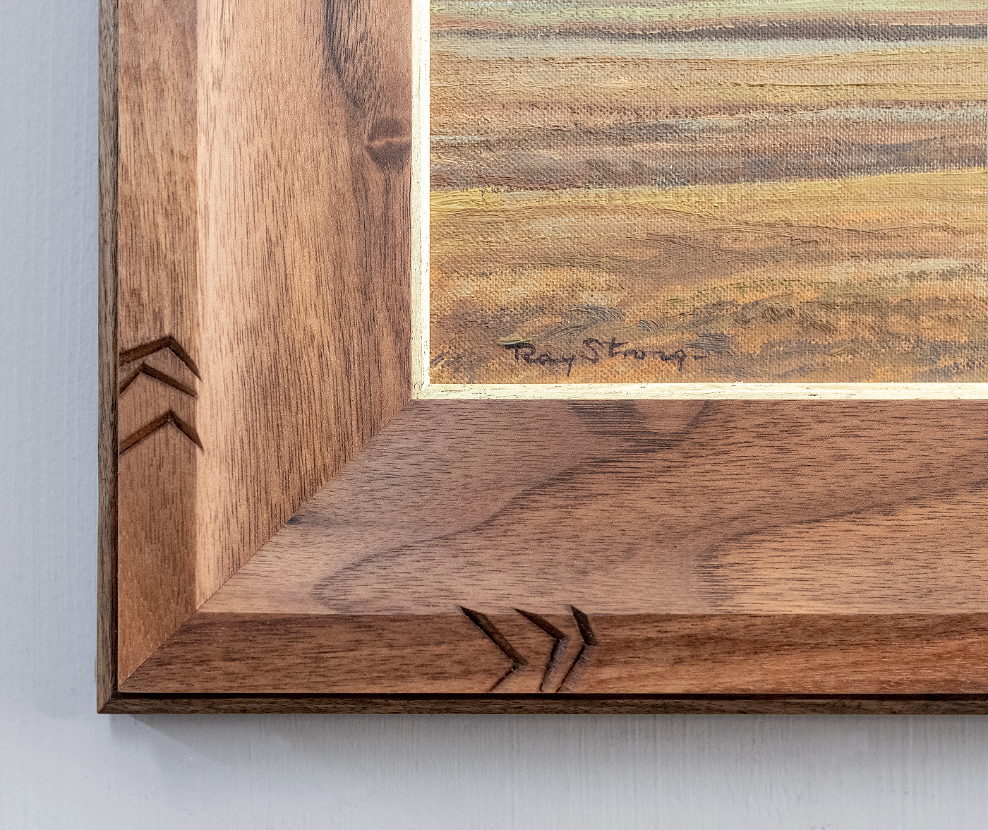 The land forms provided plenty of inspiration for the shape of the 2-1/2″ wide walnut frame. The profile slopes up to a slight cove terminating with the raised outer flat, which has carved corners echoing the angularity of the landscape. The wood is oiled and waxed. The chamfered liner, leafed in 18 kt gold, is also carved.