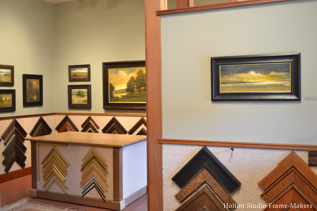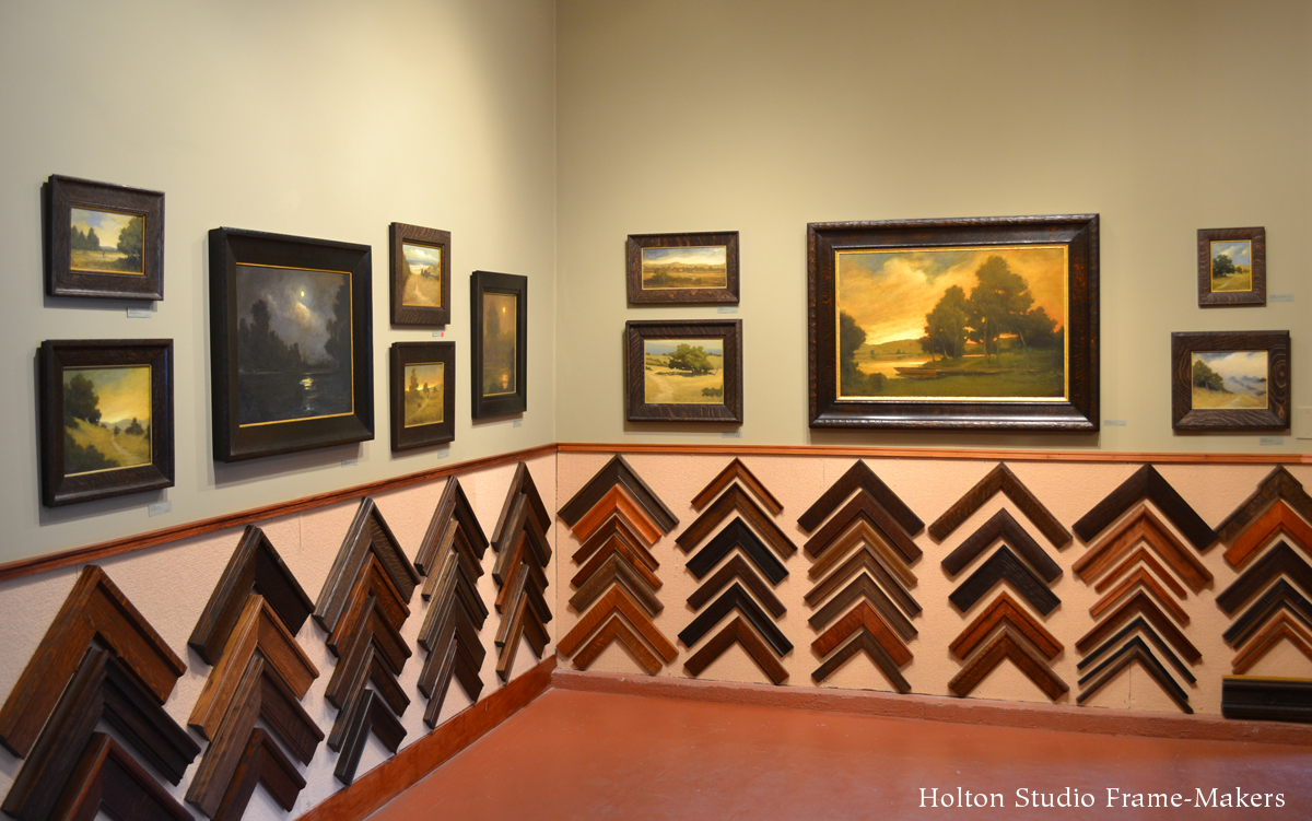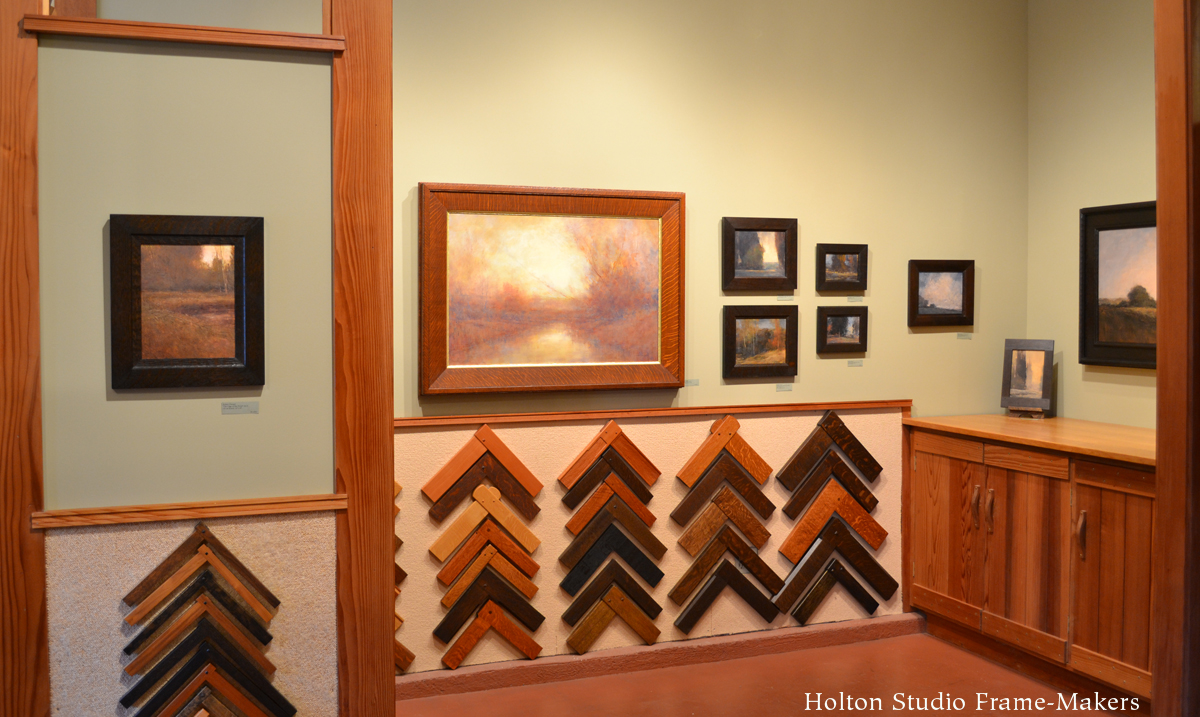Tonight’s opening of “A Continuous Harmony: New Tonalist Paintings by Robert Flanary and Paul Roehl” will be extra-special as it will also be the debut of the make-over of Holton Studio Gallery. Come join us from 5 to 7 and celebrate these two greatly talented and wise landscape painters. Here’s a before and after shot. As you can see, the corner sample display has largely been turned over to the presentation of paintings.