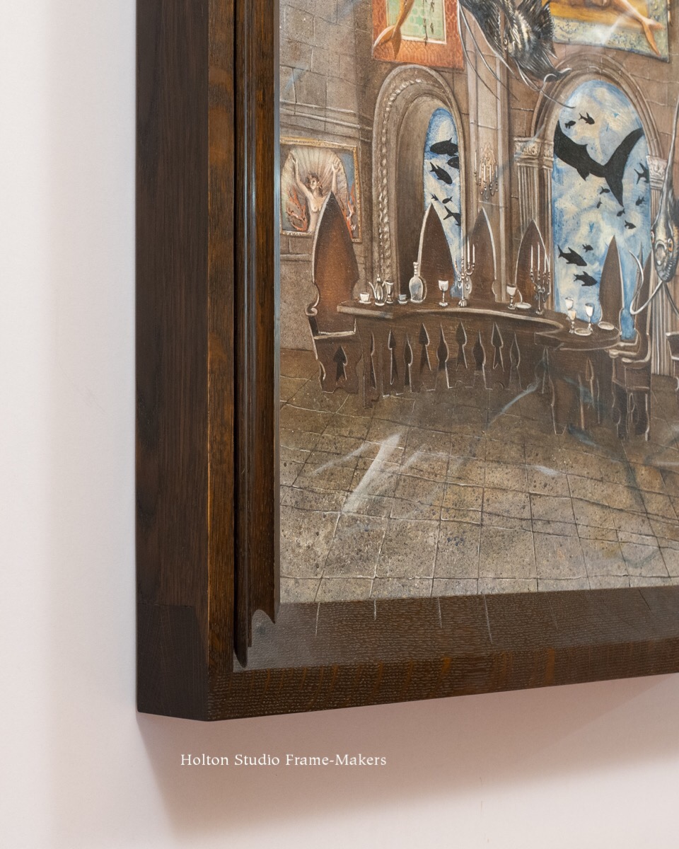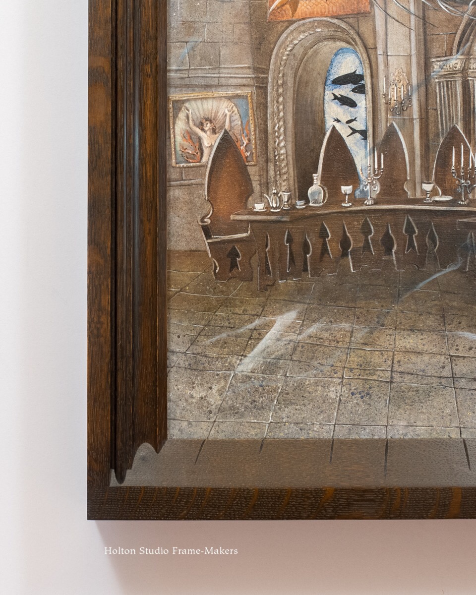 “Atlantis,” egg tempera on linden board, 18″ x 24″ in 2-1/2″ sill frame in quartersawn white oak (Dark Medieval Oak stain).