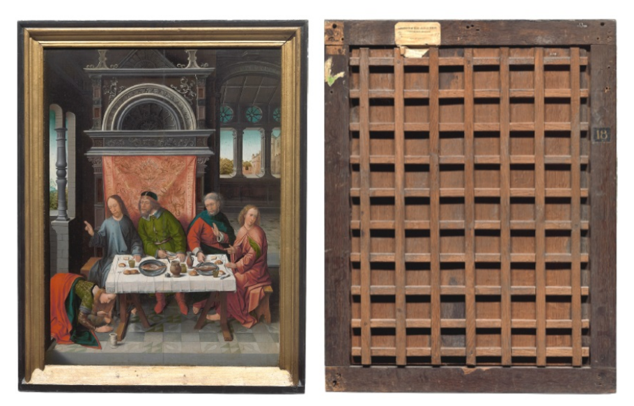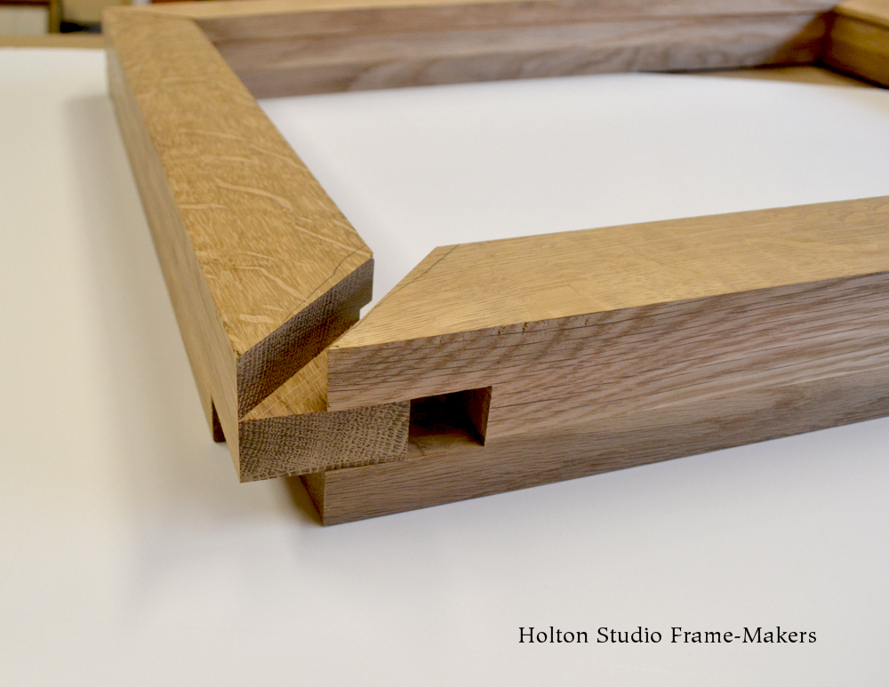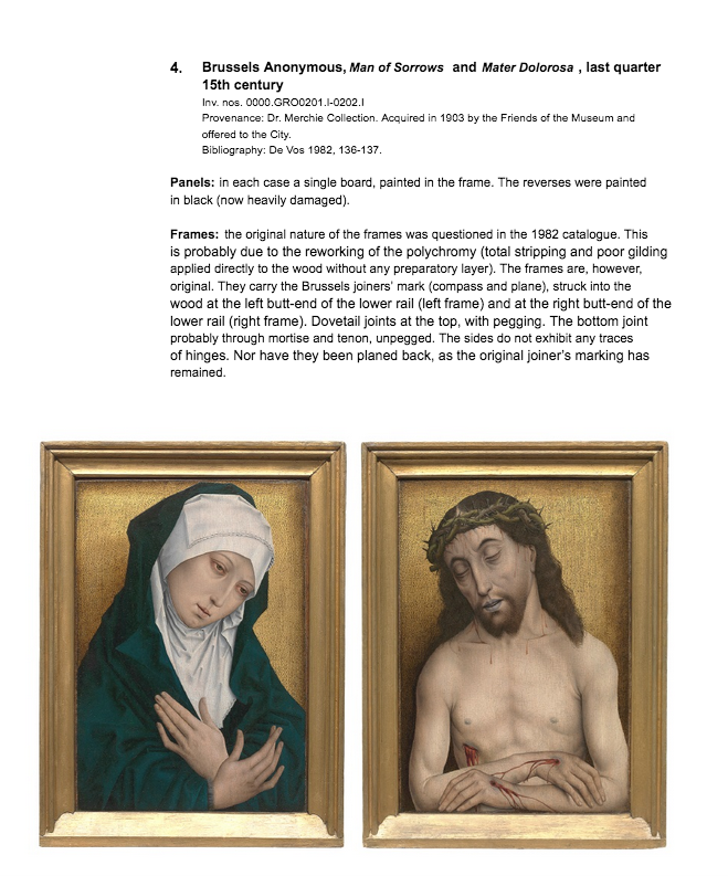 I’ve admired Northern Renaissance (especiallly Flemish Primitive) sill frames for a long time. (One famous example you may recognize and that I’ve posted about is Hans Memling’s “Christ Giving His Blessing,” at right.) Karima’s show was the perfect opportunity to try my hand at them. Research led me to an incredible treasure trove of examples—a 734-page online book dryly titled Frames and Supports in 15th and 16th Century Southern Netherlandish Painting, by Hélène Verougstraete (2015, Royal Institute for Cultural Heritage, Brussels). Written for painting conservators tasked with treating work of that period, it is also a frame-maker’s dream—a gold mine of excellent high-resolution photographs of paintings in their frames. (It’s shocking how frequently paintings are shown in books with their frames cropped out—even frames made by or in cooperation with the painter, or in any case original to the painting). But just as exciting for me is the exhaustive research on joinery [“We have observed 38 different joints, which we have classified into 6 families: mortise and tenon joints, dovetail joints, slotted joints (also known as bridle or open tenon or tongue and fork), lap joints, joints with inserts (splined or keyed joints), end-to-end joints…”; you get the idea], and loads of clear diagrams of all those joints and how the frames and supports were constructed. Not all, but the vast majority of the paintings in the book are in sill frames, suggesting that in that region (today’s Low Countries) it was the dominant type of frame for over a century.